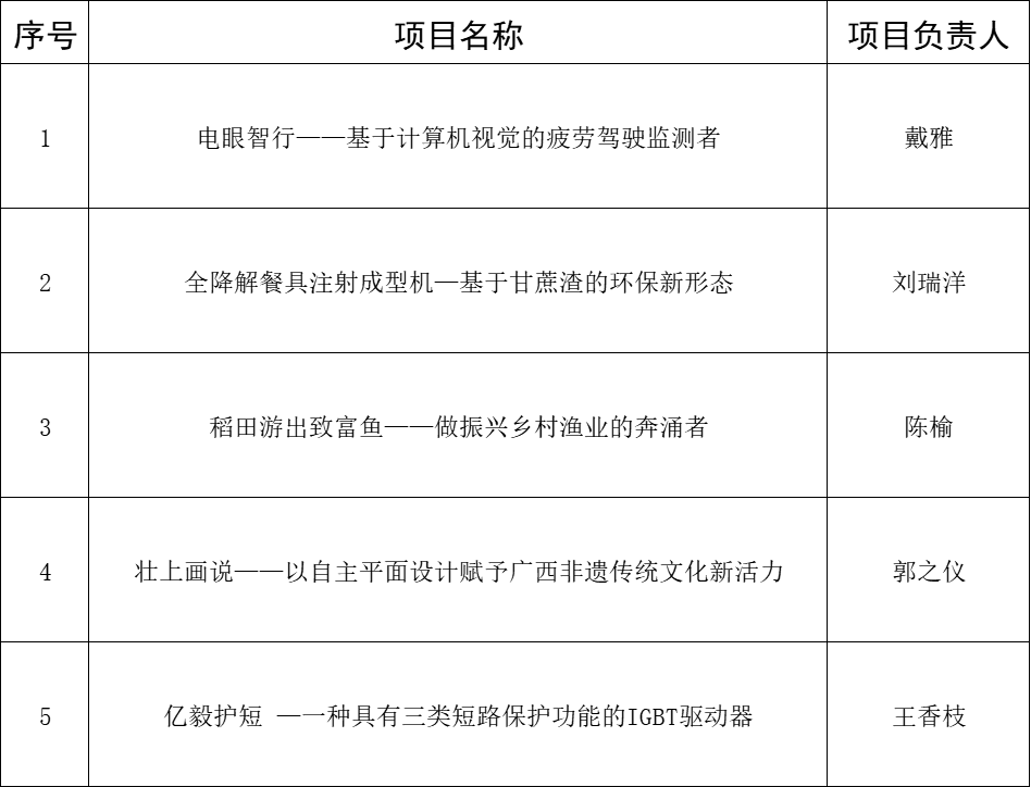 本届比赛全面贯彻创新、协调、绿色、开放、共享五大发展理念,共设“科技创新和未来产业”、“乡村振兴和脱贫攻坚”、“城市治理和社会服务”、“生态环保和可持续发展”、“文化创意和区域合作”五个组别。全院共接收到参赛作品38项,学院团委邀请了院内外具有创新创业大赛丰富指导经验的老师担任院赛评委,通过专家网评的方式,最终遴选出“电眼智行——基于计算机视觉的疲劳驾驶检测者”等5个项目推荐参加校赛(见下图)。