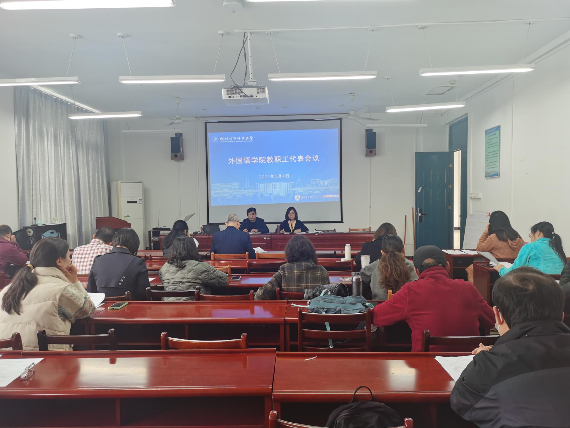 3月4日下午,外国语学院在3505会议室召开2022年第一次教职工代表大会,全体代表出席会议,党委书记杨丹江主持会议。