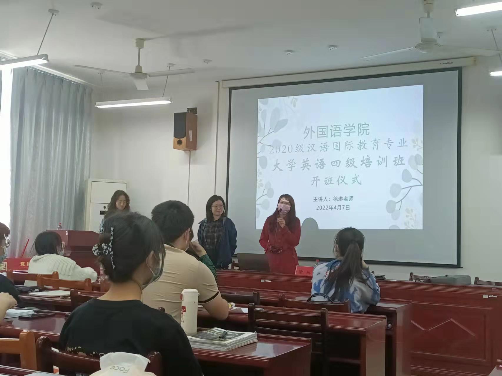 4月7日下午,外国语学院2021-2022学年第二学期大学英语四级培训班在花江校区3505会议室顺利开班。学院党委副书记段筱雨、大学英语二系优秀教师徐琳和2022年大学英语四级的报考学生参加培训班开班仪式,2020级辅导员屈玉洁主持。