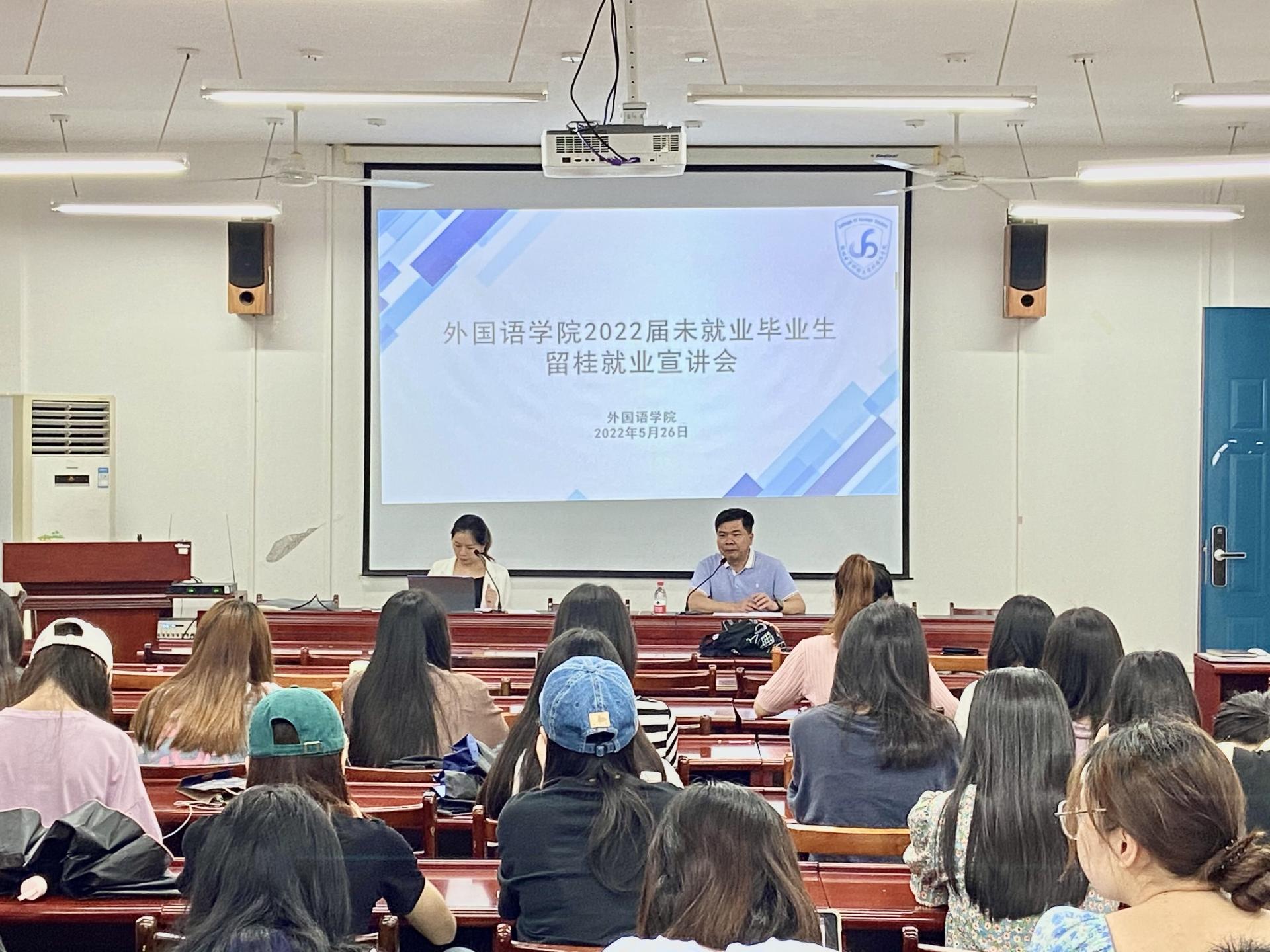 5月26日下午,外国语学院在花江校区3505会议室留桂就业宣讲会,会议邀请了桂林爱索家居用品股份有限公司、桂林锐锋医疗器械有限公司、桂林唐朝国际旅行社有限责任公司等3家桂林企业来校招聘。学院党委书记杨丹江、副书记段筱雨,3家企业招聘负责人,2022届未就业毕业生一同参加了宣讲会。