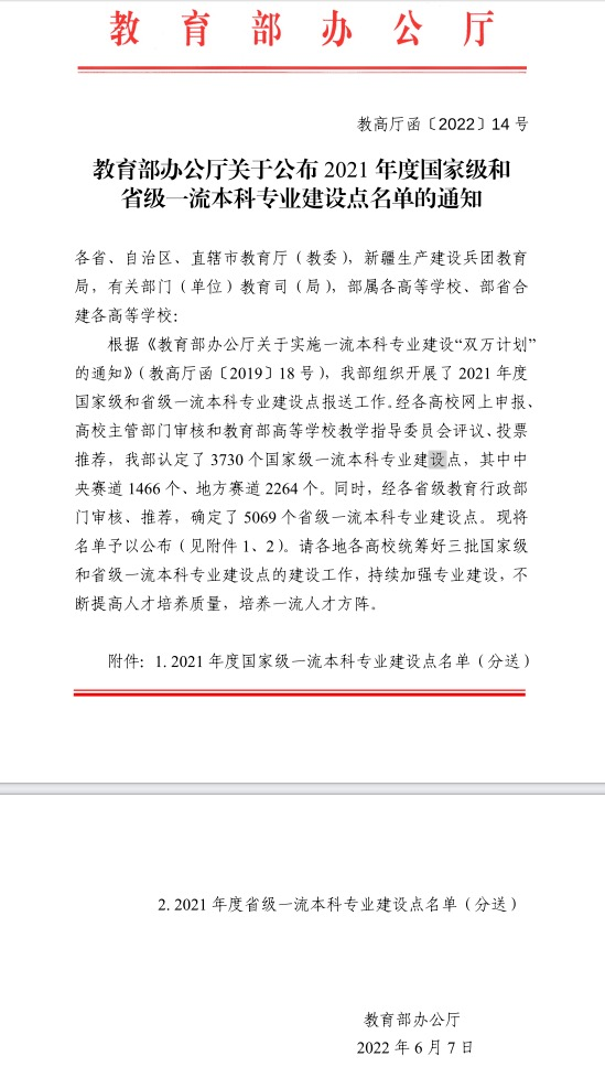近日,教育部高教司办公厅印发《关于公布2021年度国家级和省级一流本科专业建设点名单的通知》(教高厅函〔2022〕14号),正式公布2021年度一流本科专业建设“双万计划”(国家级和省级一流本科专业)建设点名单。我院英语专业获批省级一流本科专业建设点。