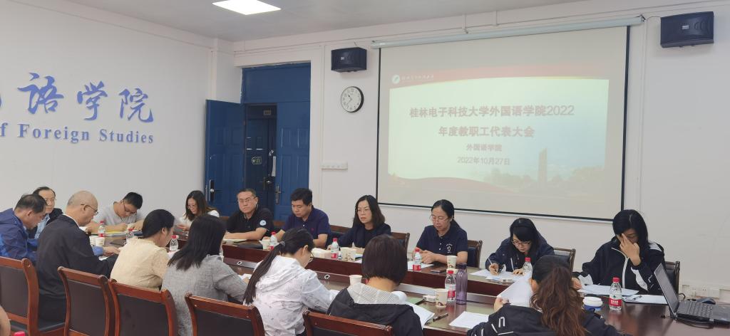 10月27日下午,外国语学院在3408会议室召开2022年第二次教职工代表大会,全体教职工代表出席会议,会议由学院党委书记杨丹江主持。