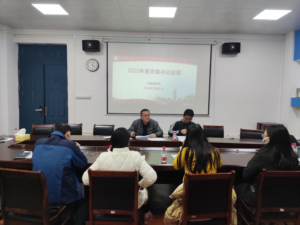12月7日下午,外国语学院党委在花江校区第三教学楼408会议室召开了学院2022年度党支部书记述职评议会。学院党委委员、全体党支部书记参加会议。