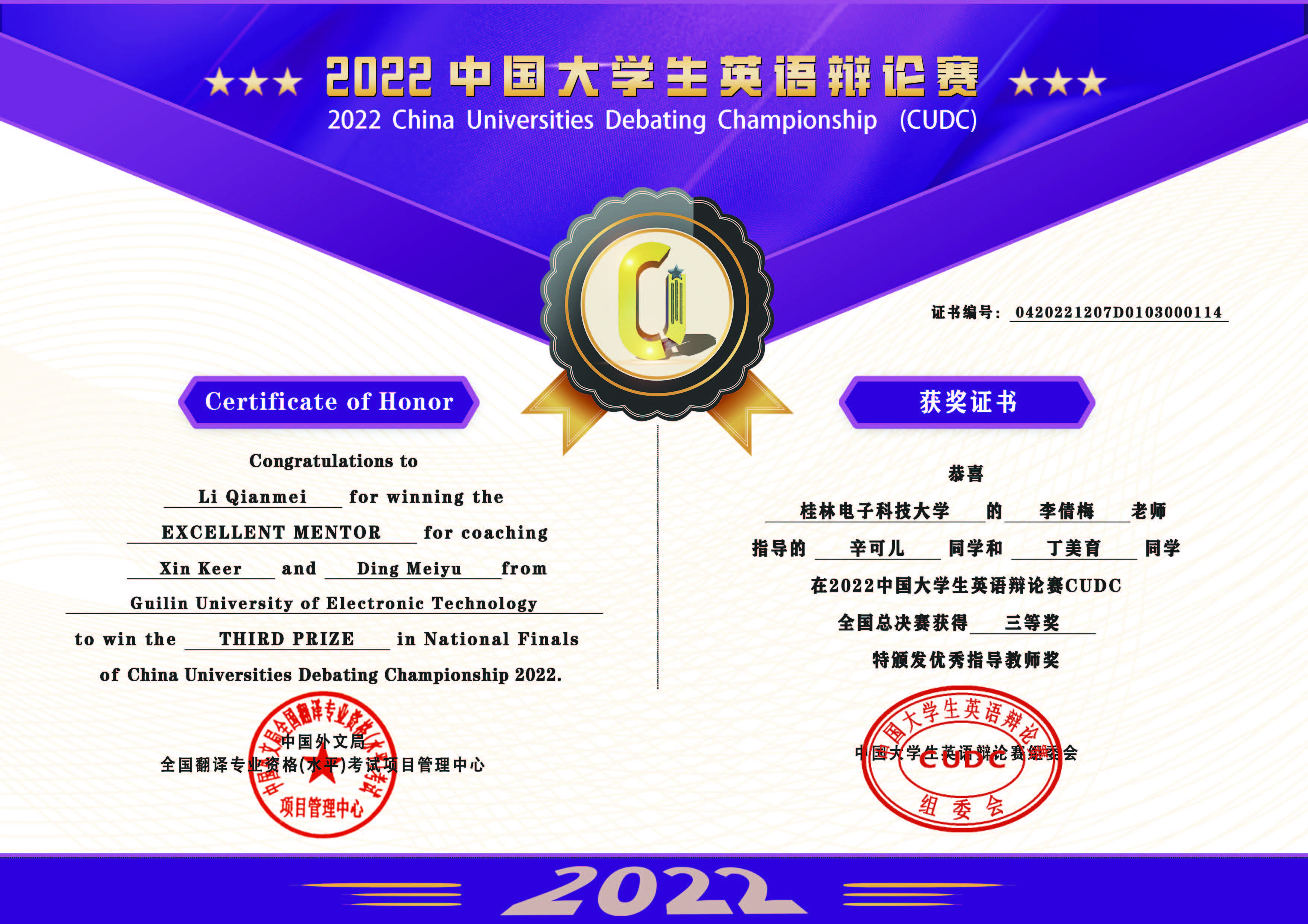 经过五轮循环赛的激烈角逐,由我校外国语学院教师李倩梅任指导老师、机电工程学院2020级学子辛可儿和外国语学院2020级学子丁美育任辩手的代表队凭借优异的表现,荣获全国总决赛三等奖。