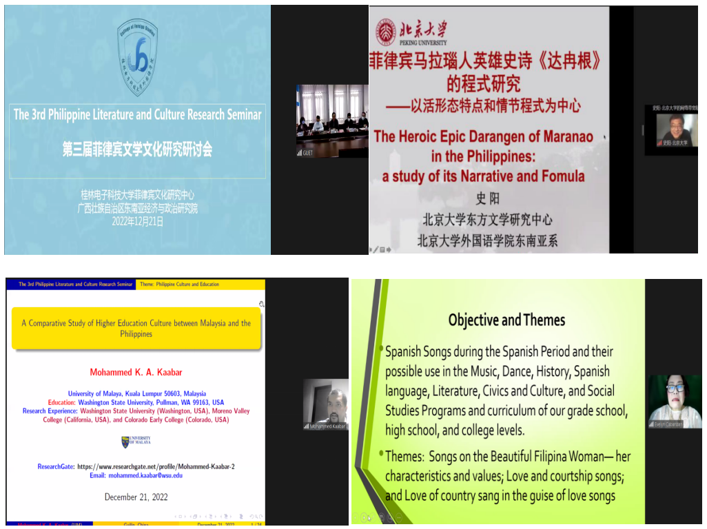 12月21日,由桂林电子科技大学菲律宾文化研究中心、自治区东南亚经济与政治研究院联合主办的第三届“菲律宾文学文化研究”研讨会圆满举行。学校总会计师曹辉景、自治区东南亚经济与政治研究院院长李冬青出席会议并致辞,开幕式由外国语学院院长黄宇元主持。