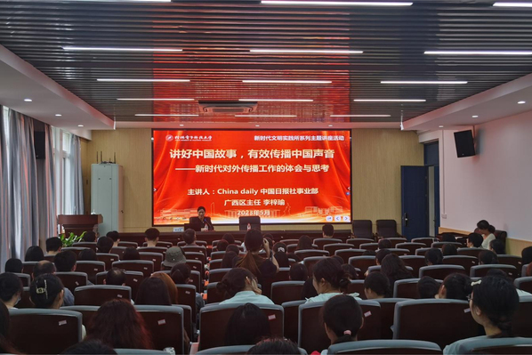 5月26日,由校党委宣传部主办、外国语学院承办的新时代文明实践所2023年第五场理论宣讲活动在花江校区第三教学楼305会议室举行。活动邀请了ChinaDaily中国日报事业发展部广西区主任、学院94级校友李梓瑜作了题为“讲好中国故事,有效传播中国声音”的专题报告。报告会由学院党委书记杨丹江主持,学院全体师生党员参加。