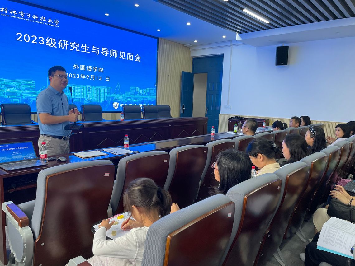 9月13日下午,桂林电子科技大学外国语学院2023级研究生与导师见面会在花江校区3305教室举行。学院各级领导、硕士生导师、研究生教学秘书以及2023级全体研究生参加会议,会议由学院研究生教育系主任莫如愚主持。