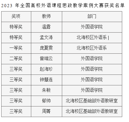 近日,2023年全国高校外语课程思政教学案例大赛公布评审结果,我校教师作品在全国各省市自治区各个高校的众多作品中脱颖而出,获特等奖2项、一等奖1项、二等奖2项、三等奖5项。其中,温露、孟文涛获特等奖,庞夏雯获一等奖,曾瑞云获二等奖,赵海珍、钟慧连、朱敏、郁帅、周菁获三等奖。