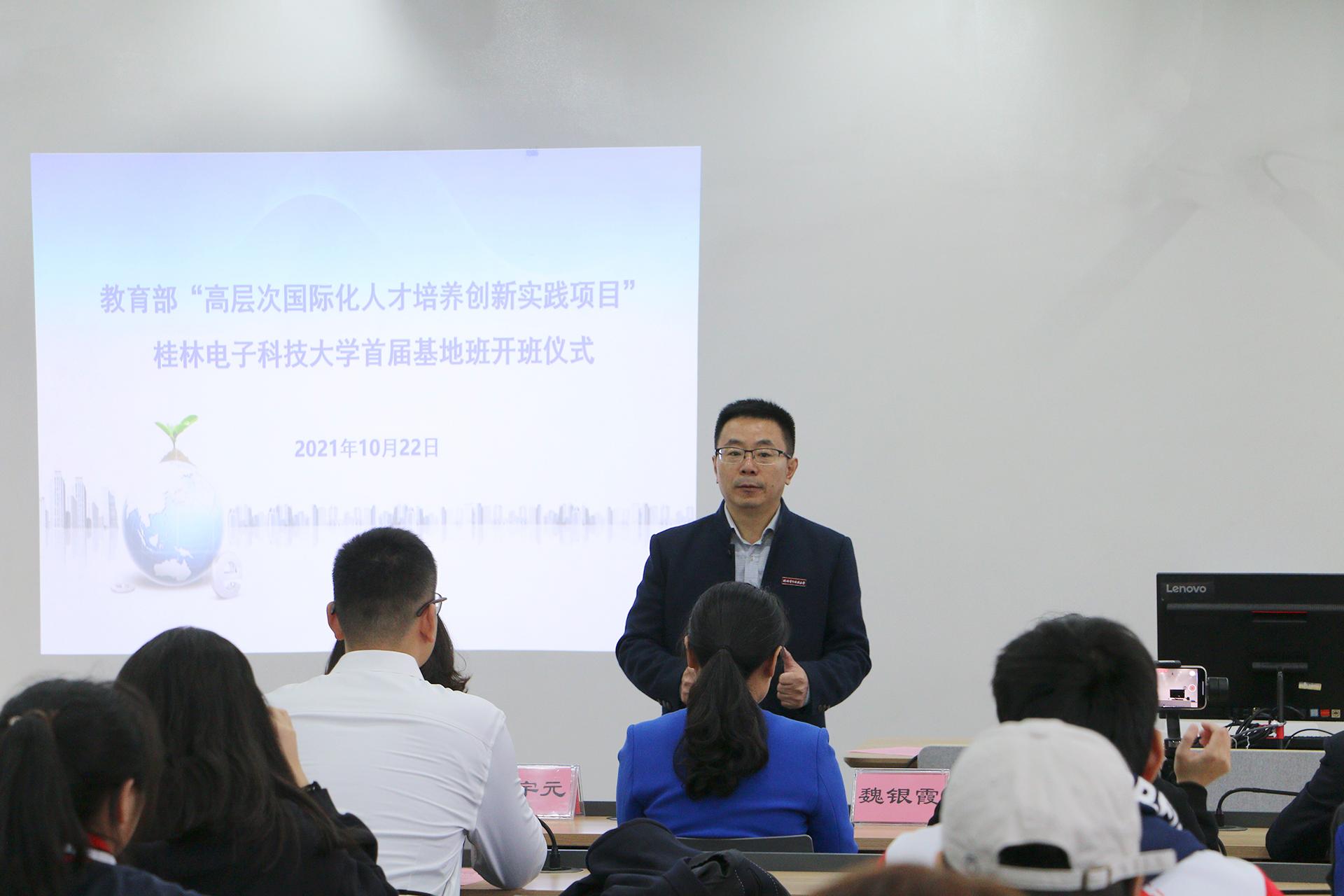 开班仪式上,潘开林就学校实施“高层次国际化人才培养创新实践项目”的背景及重要意义进行了说明,他表示,学校将整合力量,聚集资源,培养具有家国情怀、创新能力、国际视野和全球治理能力的高质量国际化精英人才,并勉励基地班学生成为堪当时代大任的复合型国际化人才。王玥就基地班学生国际交流实践环节的组织实施提出了指导意见。外国语学院相关负责人对基地班人才培养方案、教学计划进行了详细说明。