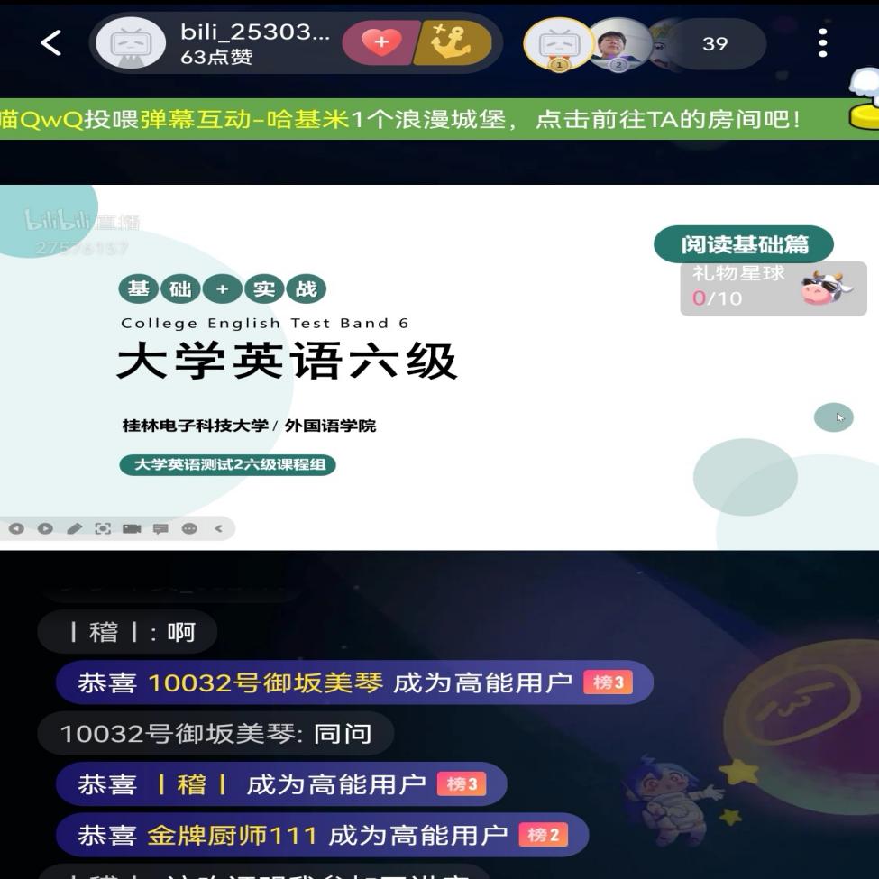 第一场讲座“大学英语六级阅读应试技巧”于2023年10月25日晚在B站进行,由我院黄懿老师主讲。黄老师解读了大学英语六级考试大纲,并从考核要求、考核内容以及考核题型比较大学英语四级考试与大学英语六级考试异同点,同时结合2023年6月六级真题题目,介绍如何理解仔细阅读中长难句的方法。黄老师讲解耐心细致,重点突出,实用性强,善于启发引导学生,学生受益匪浅。