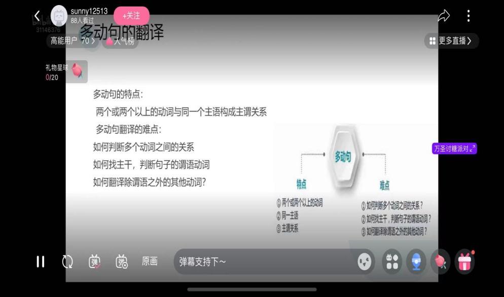第三场讲座“大学英语六级翻译应试技”于2023年11月1日晚在B站完成,由杨丽华老师主讲。杨老师以近年来的六级翻译真题为例,分析了翻译材料的命题取向,对如何总结积累常备词组、句型,如何翻译长难句等进行了详细的讲解。杨老师讲解细致,为学生在词汇句型提升,灵活运用翻译策略等方面提供了具有实操性的方法和建议,帮助学生高效备考。