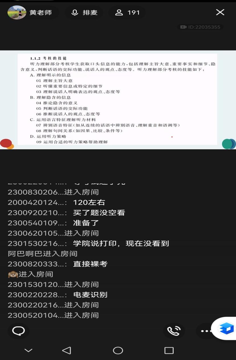 第二场讲座“大学英语四级听力应试技巧”于2023年10月30日晚在QQ群课堂完成,由黄婧老师主讲。黄老师从考试大纲听力部分的技能要求、做题的时间分配、听力实战和听力基本功四个方面对大学英语四级听力考试、技巧和备考进行全面解读。整场讲座在线人数有200余人,评论区内学生互动热烈,讲座气氛活跃。