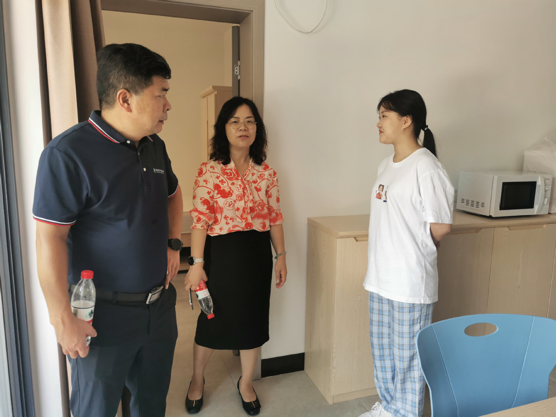 学院领导在宿舍与同学们亲切交流,仔细询问他们的学习、生活情况,尤其就对新宿舍住得习不习惯,喜欢不喜欢、有没有什么建议进行了具体交流,并鼓励同学们珍惜校园时光,勤奋学习。