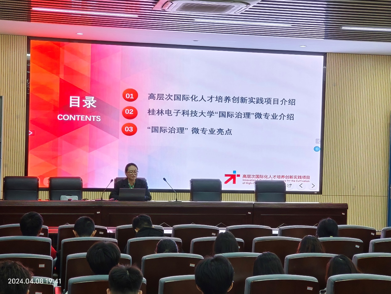 4月8日,学校第六期“高层次国际化人才精英班”(以下简称“精英班”)暨“国际治理”微专业招生宣讲会在花江校区3305报告厅举行。外国语学院院长助理黄晓玲、精英班负责老师杨华、精英班班主任李攀攀参加宣讲会。
