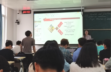 本次公开课的教学主题是“Health and Emotions(健康与情绪)”。教学内容是基于对情绪理论概念的理解和学习一个消极情绪对人们身心健康影响的学术报告,完成一份对学生们自己日常经历的某一种消极情绪进行概念定义、负面影响分析、积极应对方法建议的演讲稿。这对于大学英语普通班学生而言,无论是心理学领域的语料的理解,还是掌握学术写作文本结构的要求,都是一次全新的难度挑战。在教学过程中,莫建萍老师通过整合教材内容进行难度分级,将本章的Critical Thinking Skill (批判性思维技能)和Academic Skill(学术研究技能)学习结合一段学术报告的内容与结构来讲解,给学生提供一个具象实例的同时,又让学生有可操作的脚手架,提升了学生“我能行”的自信心和创造力。