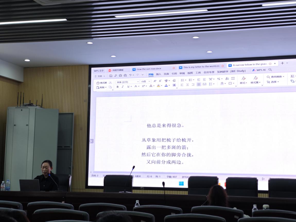 会上,吕丽塔教授鼓励同学们积极参与,勇于分享,在阅读和交流中拓展学术视野,提升研究能力。曾轶峰博士作题为“我们与‘她’的距离:艾米莉·狄金森诗歌的翻译研究”的报告。她以独特的视角,带领大家走进艾米莉·狄金森诗歌的世界,展现了一个与大众传统认知里完全不同的狄金森。研究生黄鑫、张佳瑶、李婷和朱宇婧,依次分享了近期所研读文献的洞见,并结合自身的阅读体会,将各自的学术成果娓娓道来,引发了与会师生的热烈讨论。参加分享会老师对各位同学的报告进行了全面细致的点评,并提出了中肯的建议。通过本次读书会活动,同学们收获了知识,增进了彼此的学习和学术交流。