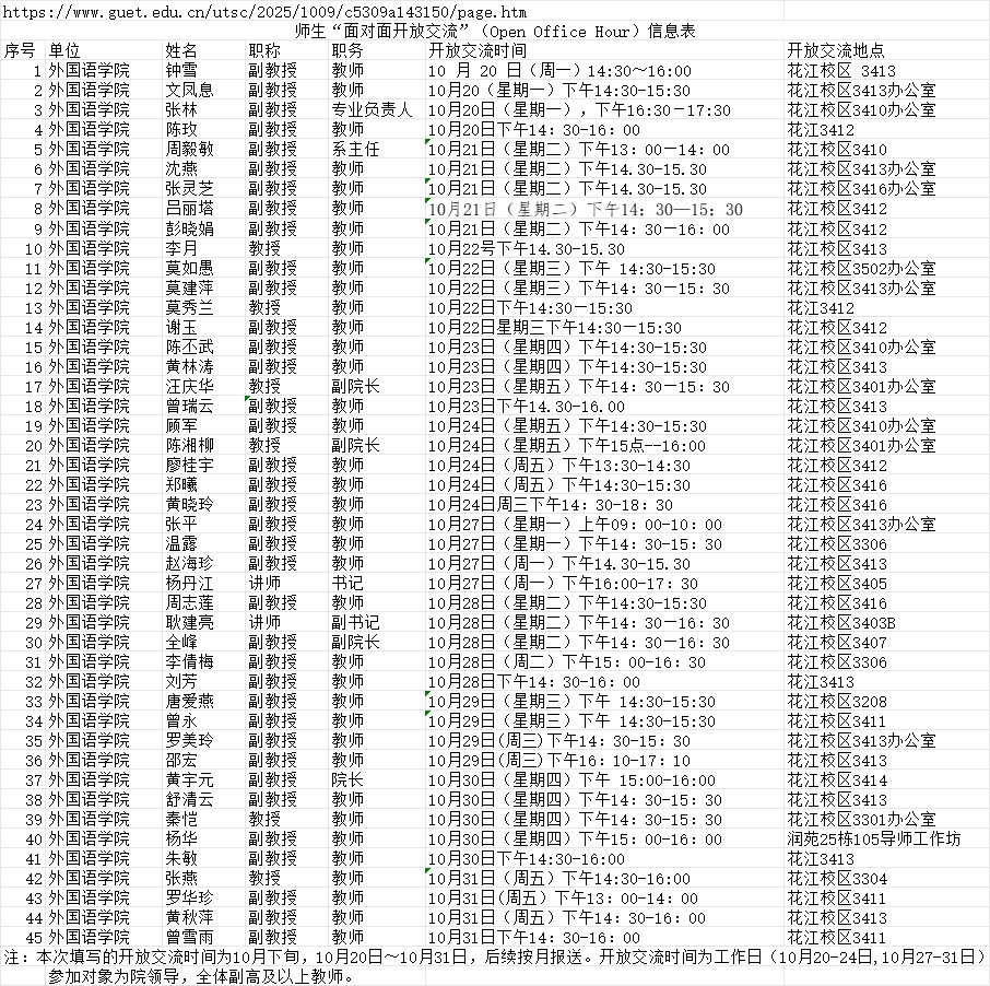 为落实立德树人根本任务,深入推进“三全育人”,加强师生交流,密切师生联系,提升育人水平,学校决定启动师生“面对面开放交流”制度的实施。参加的学生对象为全校本科生,师生交流内容包含但不限于:课程辅导答疑、学业发展规划、专业发展指导、预警学业帮扶、心理咨询辅导、校园文体活动、社会实践指导等。现将外国语学院10月下旬领导、教师参加交流的信息公布如下,学生可根据公布信息自行选择: