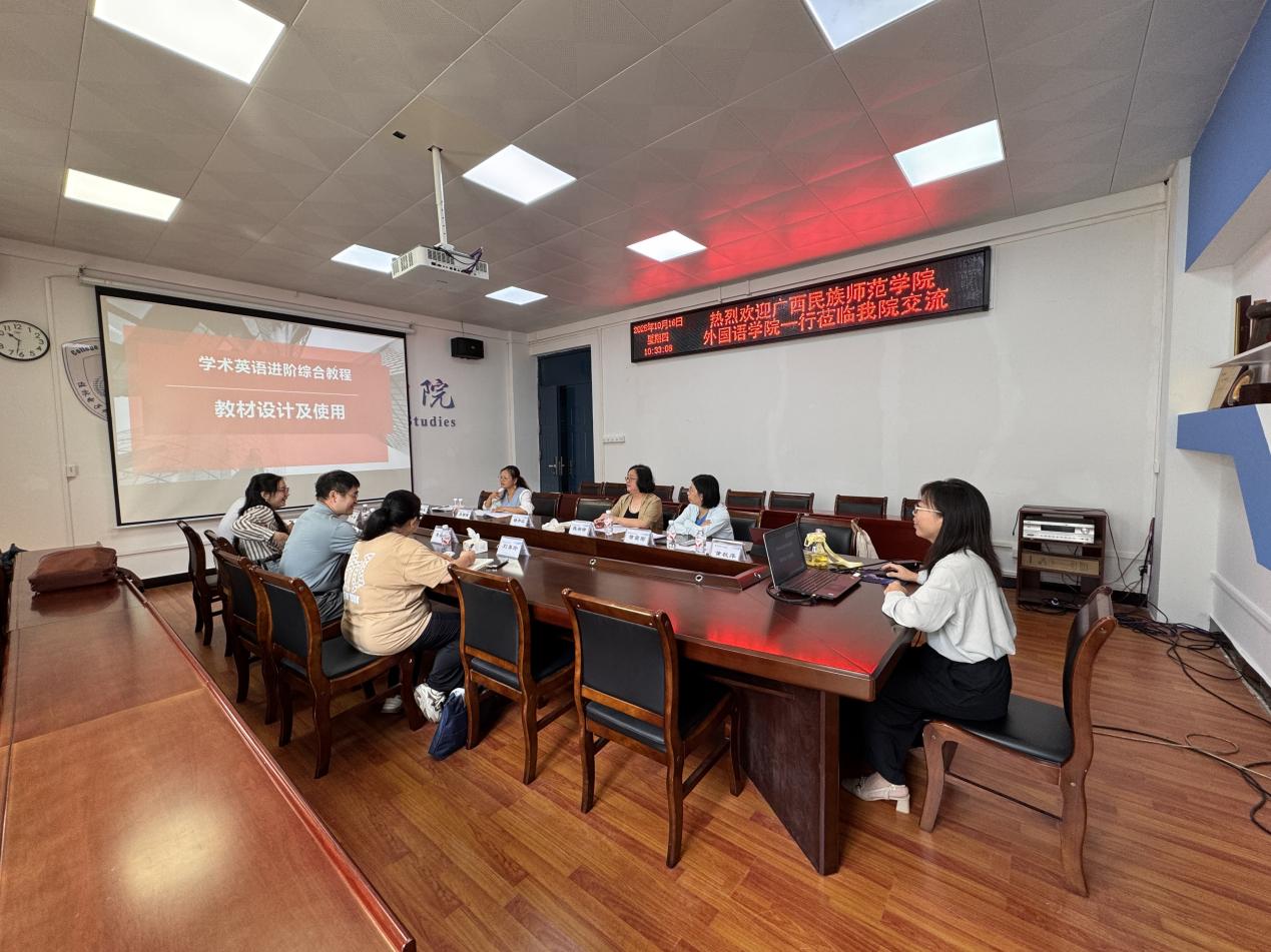 李振营介绍了广西民族师范学院外国语学院发展情况,期待与我院在教学改革、课程建设、师资发展等方面加深合作。