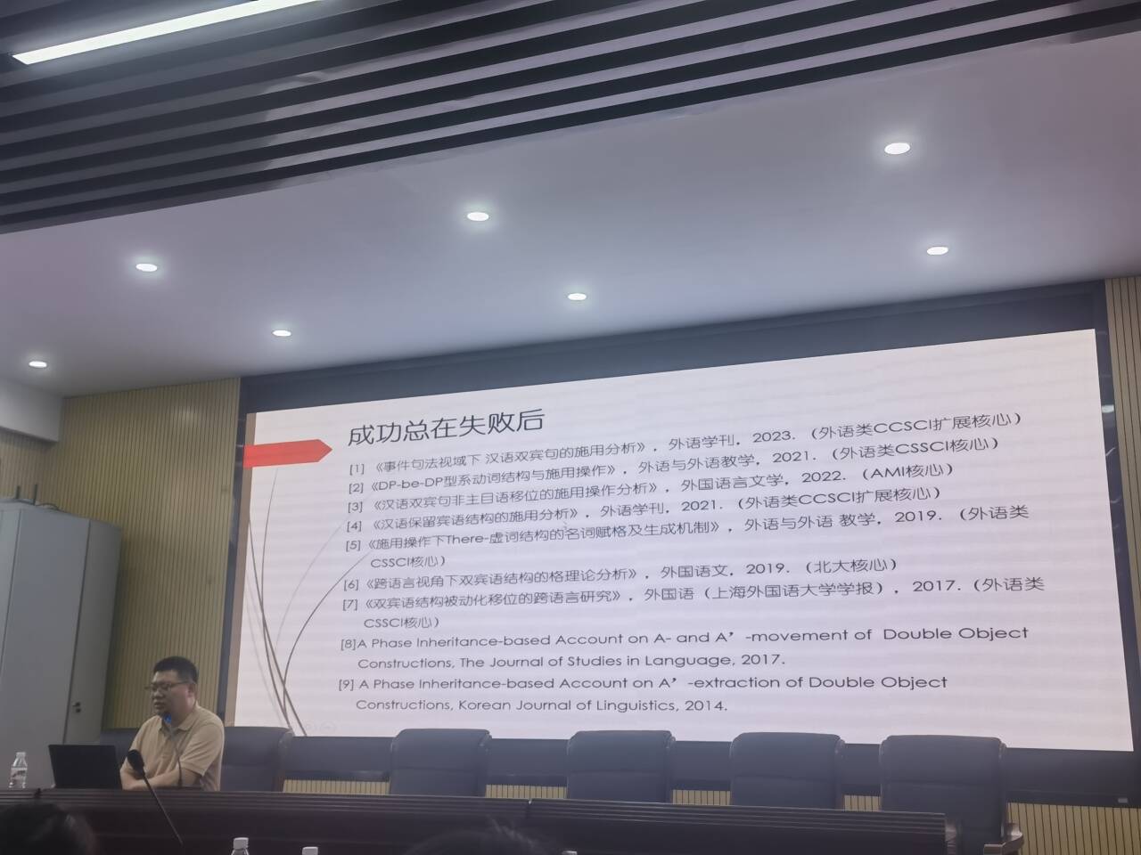全峰首先作题为“核心论文写作与经验分享”的开场报告。他结合多年科研与指导经验,系统讲解了学术论文写作的核心要点,并就提升研究质量、规范写作流程等提出实用建议,为研究生提供了清晰的学术指引。随后,三位研究生进行主题汇报。符景涛探讨了生成式AI在机器翻译中的应用潜力及其对翻译教育的启示;施冰灵从功能语言学视角分析了商务英语信函中人际语法隐喻的语用特征;高亦则从陌生化理论出发,评析了小说《素食者》的叙事策略与审美效果。汇报结束后,与会教师分别从研究设计、理论支撑与论证逻辑等方面进行专业点评,在肯定同学们创新视角的同时,也提出了有针对性的改进建议。
