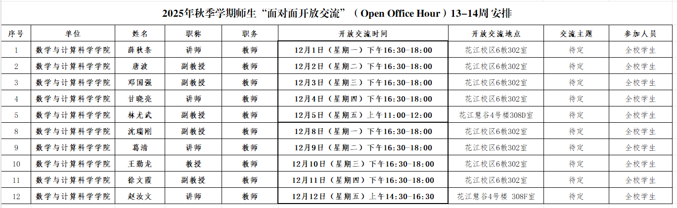 关于数学与计算科学学院师生“面对面开放交流” (第13-14周)安排公示