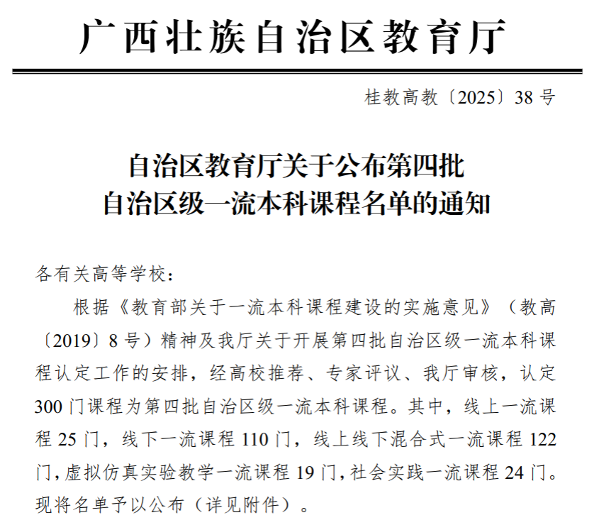 2025年11月6日,自治区教育厅发布《关于公布第四批自治区级一流本科课程名单的通知》,我校22门课程获批,其中我院5门入选。黄新老师的《电子测量与仪器》、殷贤华老师的《自动测试系统》、杨青老师的《模拟电子技术》、任风华老师的《C语言程序设计》共4门入选线下一流课程;张琦老师的《面向罗汉果采摘过程的机器人控制设计虚拟仿真实训系统》入选虚拟仿真实验教学一流本科课程。