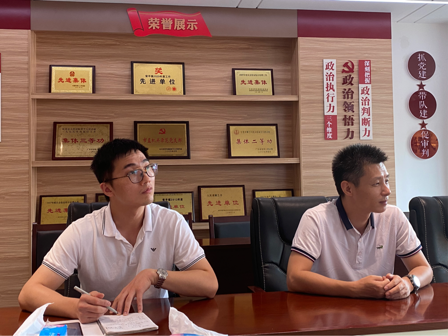 桂林电子科技大学法学院/知识产权学院教工党支部书记、实践教学中心周治德教授,常平人民法庭庭长冯鼎臣、法官刘浩宇,以及本次来常平实习的同学们一起参加座谈会,会议由冯鼎臣庭长主持。