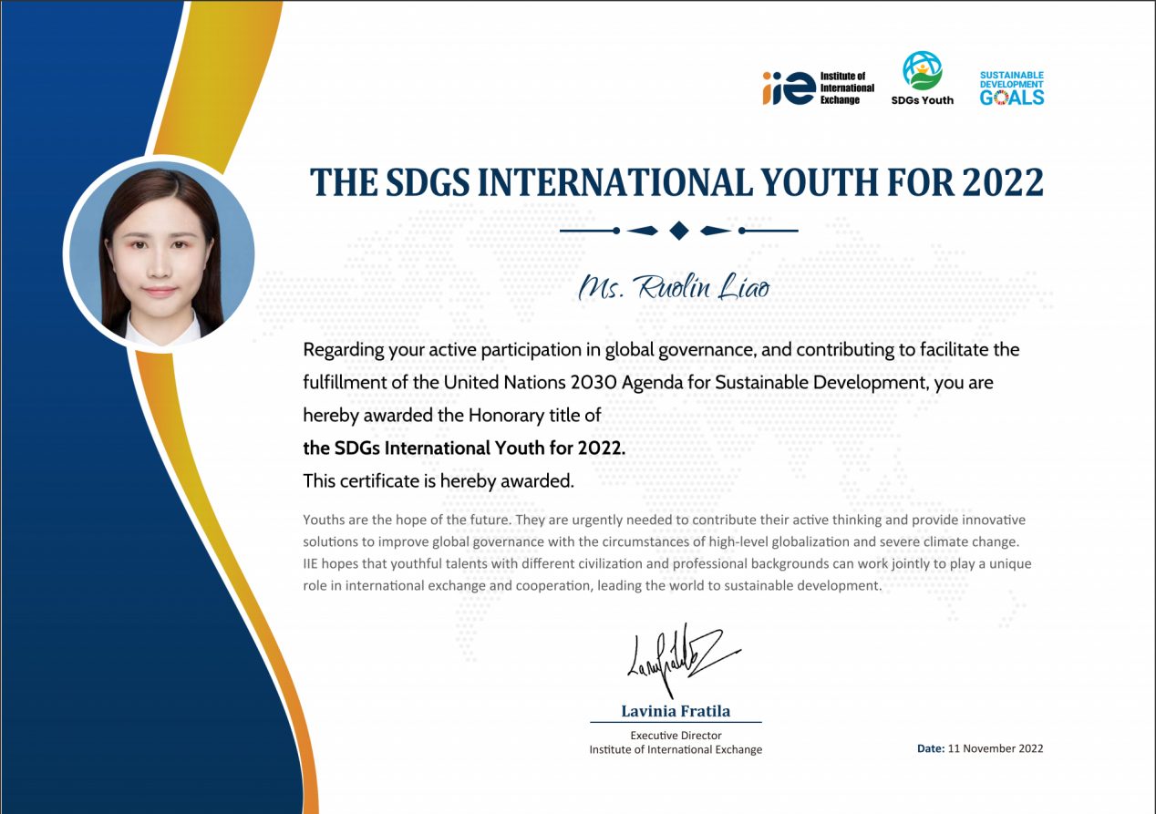 近日,法学院/知识产权学院研究生廖若琳同学被IIE授予“可持续发展目标国际青年2022”的荣誉称号,今年该荣誉称号的授予率仅不到15%。