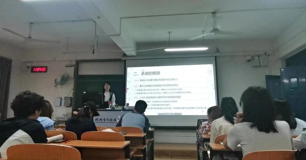 赛老师主讲的课程为《民法2》,公开课主要围绕合同的订立展开,内容丰富、形式多样、授课过程流畅。赛老师通过图表、案例以及视频相结合的方式,对要约、承诺以及悬赏广告等内容进行直观、生动地讲解。并通过雨课堂发布随堂练习,让学生深度参与课堂,并带领学生及时巩固新学知识。
