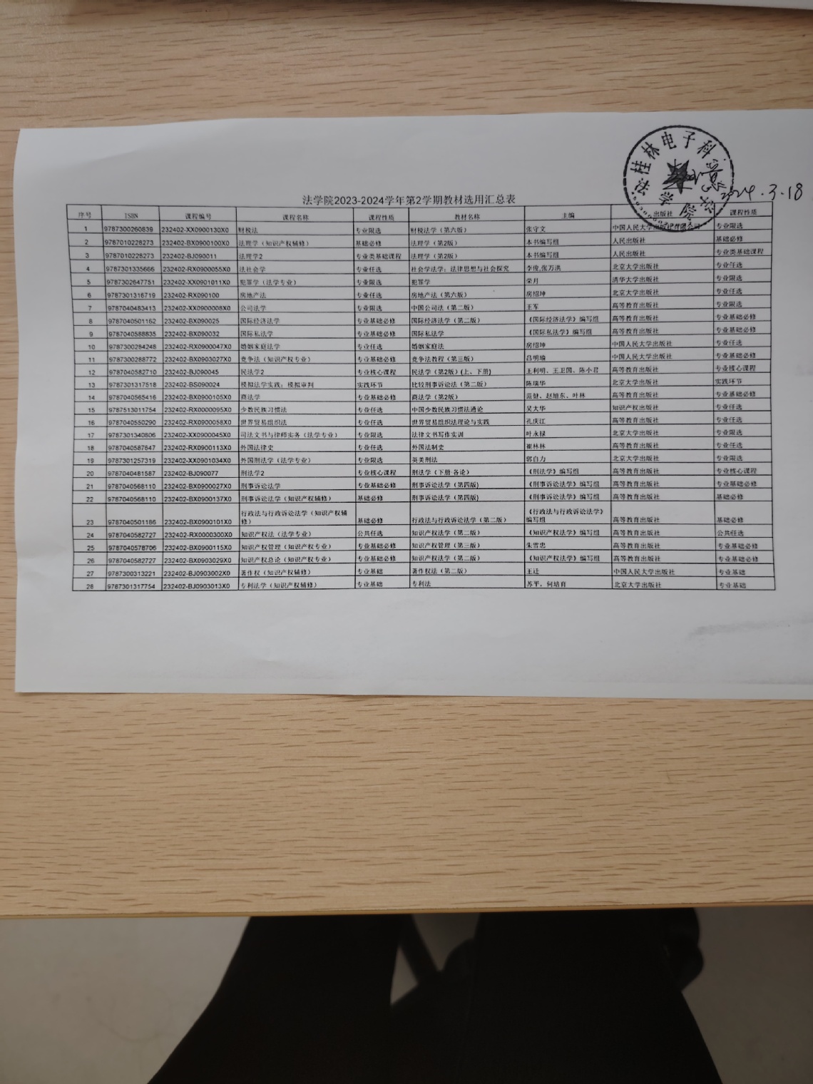 各位老师,这是2023-2024.2学期教材选用的汇总表,请各位查看。公示期间为2024年3月18日至2024年3月21日,全院师生在此期间均可提出异议。