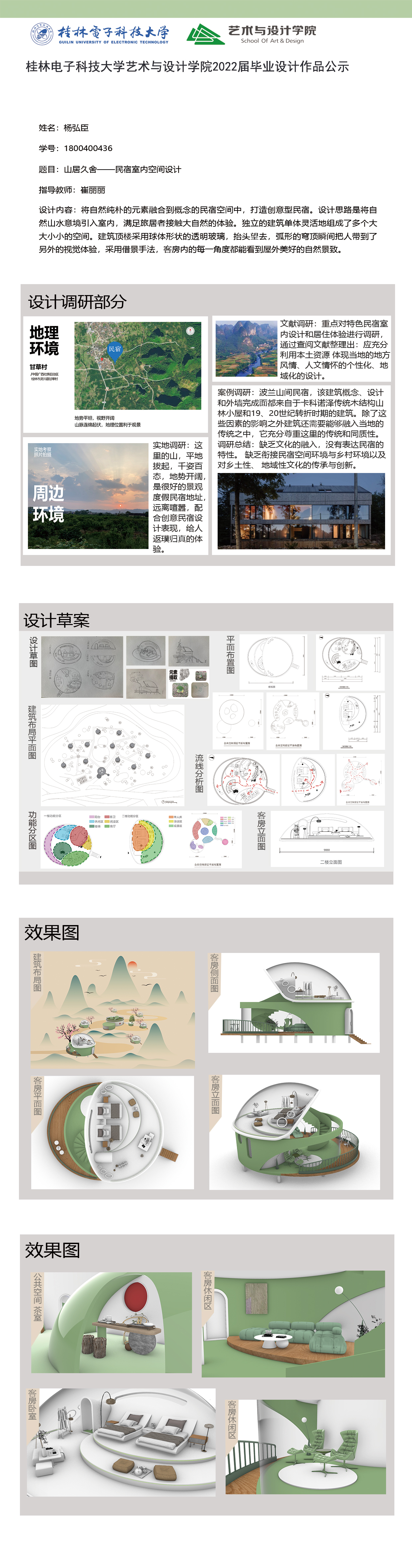 根据毕业设计管理文件规定,现将2022届环境设计专业毕业设计作品进行公示,如对所公示的作品有所争议,请实名举证,公示期为三天(2022.04.24-2022.04.26)。作品公示期间的意见反馈邮箱19059776@qq.com,联系电话:13457651975。