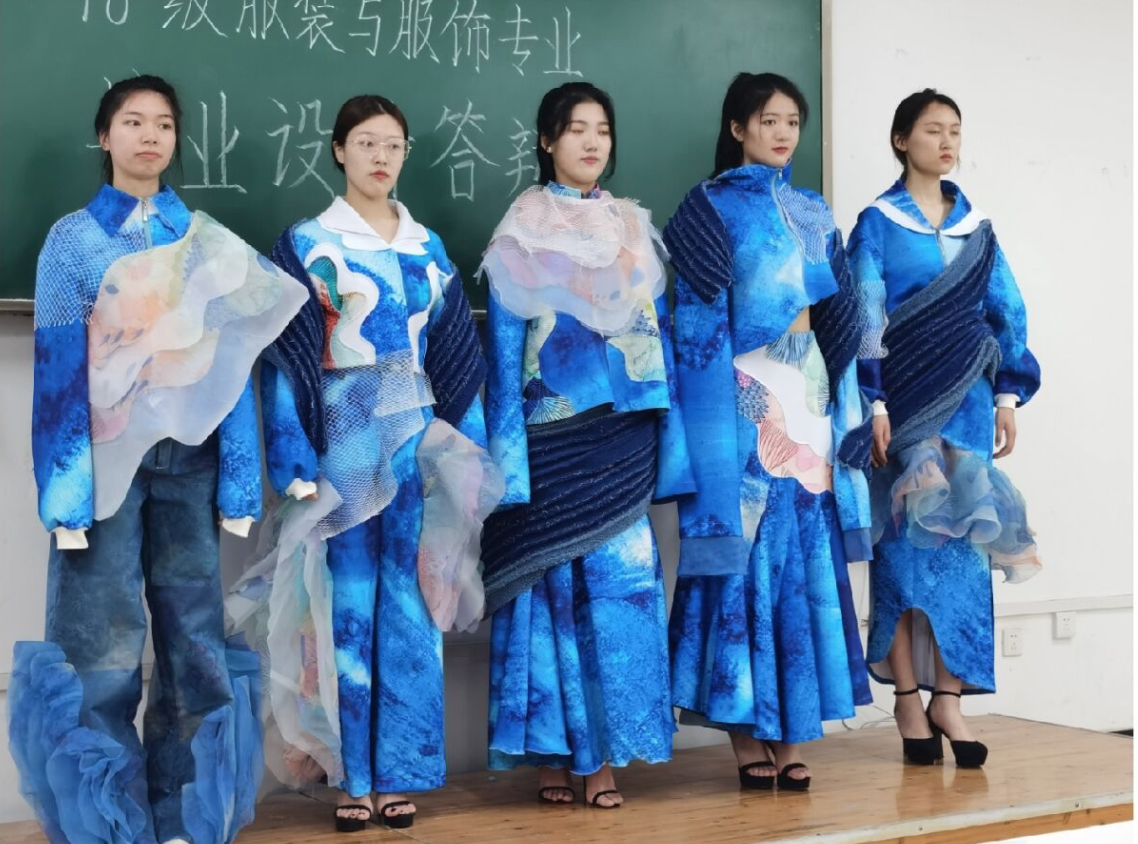 在此次答辩过程中仍发现一些问题,如:1、部分学生的前期调研不够详细,在设计方案中没有体现前期调研得到的结论,整体的逻辑性不够完善;2、部分学生存在毕设手册格式不规范的情况,如没有在封面放校标,在深色背景上放置深色文字导致阅读不便等;3、部分学生的毕设手册内容不完善,如设计方案优化过程不清晰,图案的提取与使用不清晰,缺乏制版图等情况;4、部分学生服装成衣制作不够完善,出现如未钉扣,部分未包边,局部未缝合等情况。