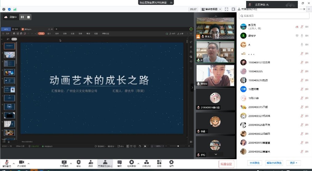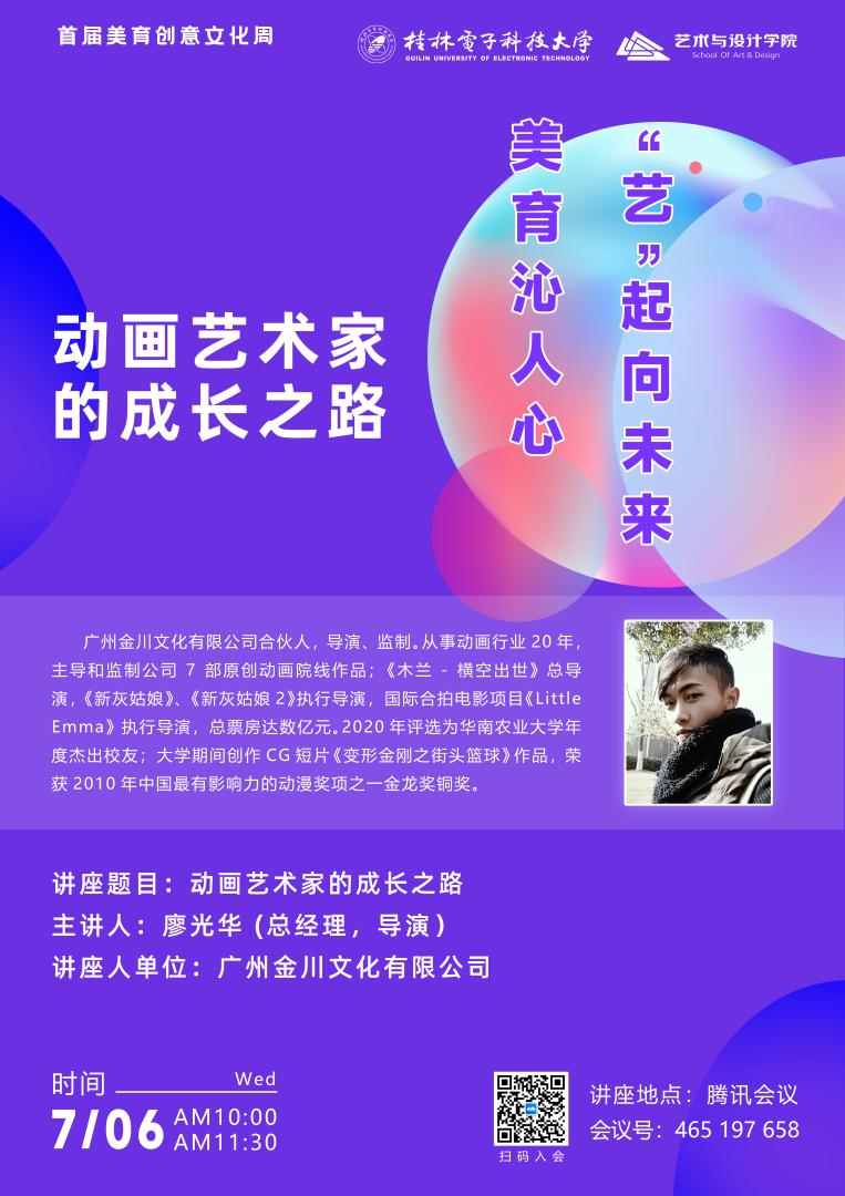 近日,艺术与设计学院全面启动了夏季"美育沁人心,艺起向未来"首届美育创意文化周活动。7月6日,受动画专业的邀请,学院产教融合实践基地合作公司——广州金川文化有限公司的导演、监制廖光华总经理为师生们做了一场主题为“动画艺术家的成长之路”线上讲座。艺术与设计学院副院长李旭出席,动画系主任彭玉元老师主持,动画专业全体师生以及对动画感兴趣的其他专业师生共200余人参加了此次讲座。