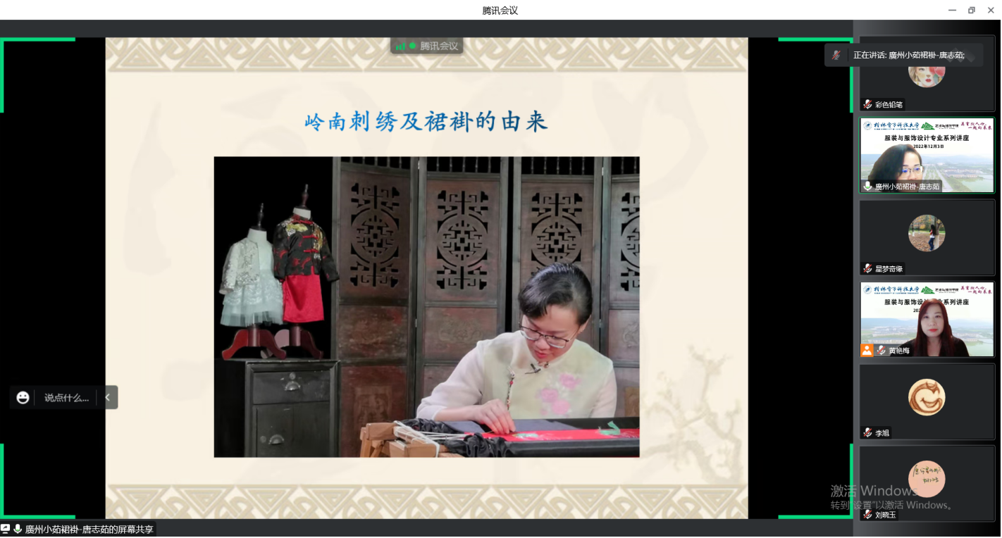 应艺术与设计学院服装与服饰设计系邀请,广东省省级钉金绣裙褂制作技艺代表性传承人唐志茹于12月3日下午14:30—16:30,通过线上腾讯会议,举办了一场主题为“以针为笔,以线作色,成就最美嫁衣”的学术讲座。本次讲座是美育沁人心,艺起向未来系列学术讲座活动。此次讲座由服装与服饰设计系系主任黄艳梅主持,由艺术与设计学院副院长李旭致辞,唐志茹讲解了岭南刺绣及裙褂的由来、裙褂的演变历史、裙褂的种类及制作工艺,赢得了大家的好评,本次讲座取得圆满成功! 功!