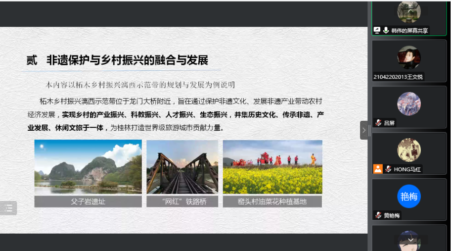 艺术与设计学院服装与服饰设计系邀请文化和旅游部2022年度乡村文化和旅游带头人,广西桂林柘漓乡村运营产业园管理有限公司董事长,广西桂林威逊体育文化有限公司执行董事韩伟,于12月6日下午15:00—17:00,通过线上腾讯会议,举办了一场以“新时代背景下文化产业的发展趋势”为主题的学术讲座。本次讲座是美育沁人心,艺起向未来系列学术讲座活动。此次讲座由服装与服饰设计系副教授马红主持,由艺术与设计学院副院长吕屏致辞,韩伟讲解了非遗保护与乡村振兴的融合与发展,以柘木乡村振兴漓西示范带的规划与发展为例,赢得了大家的好评,本次讲座取得圆满成功!