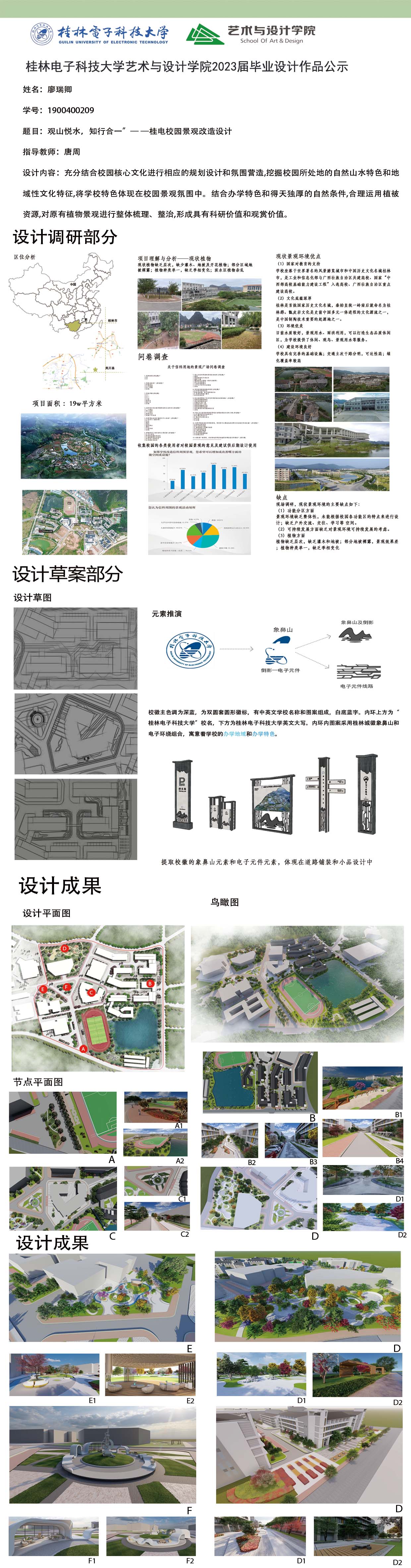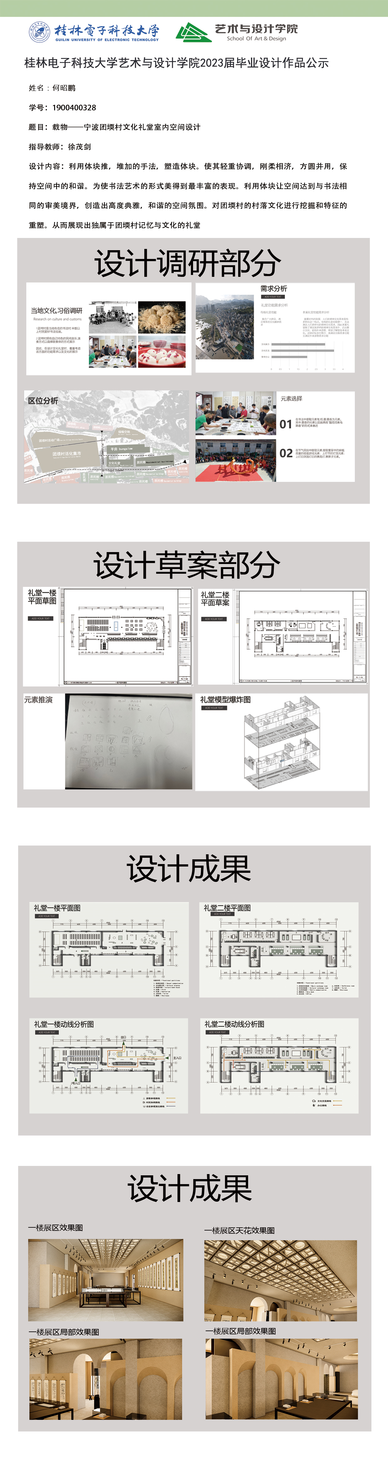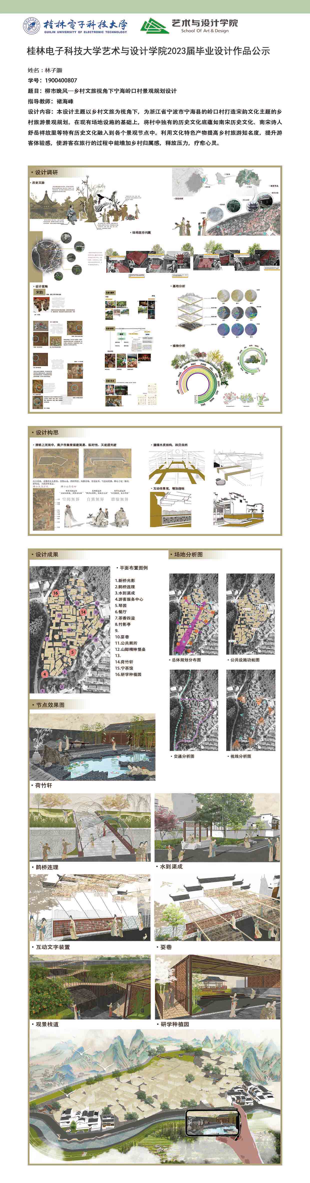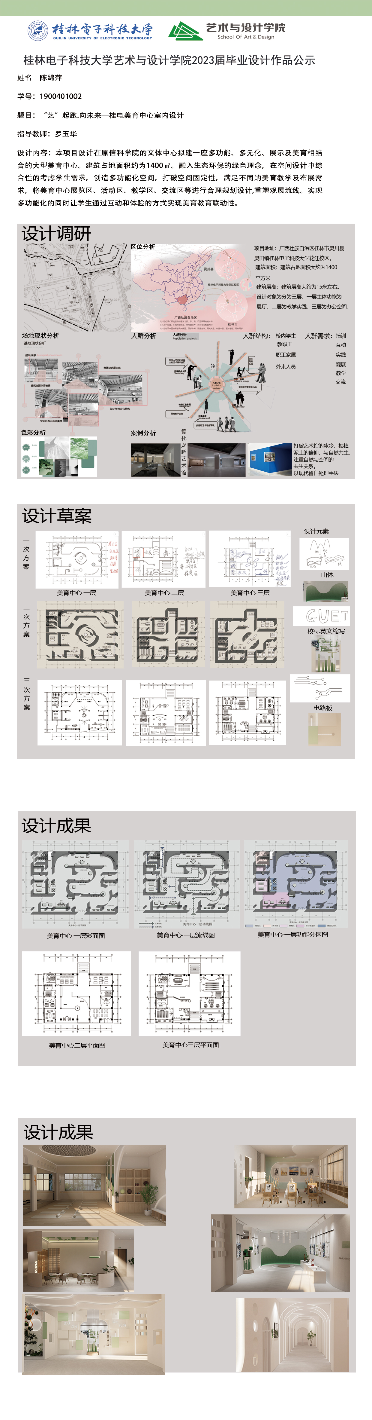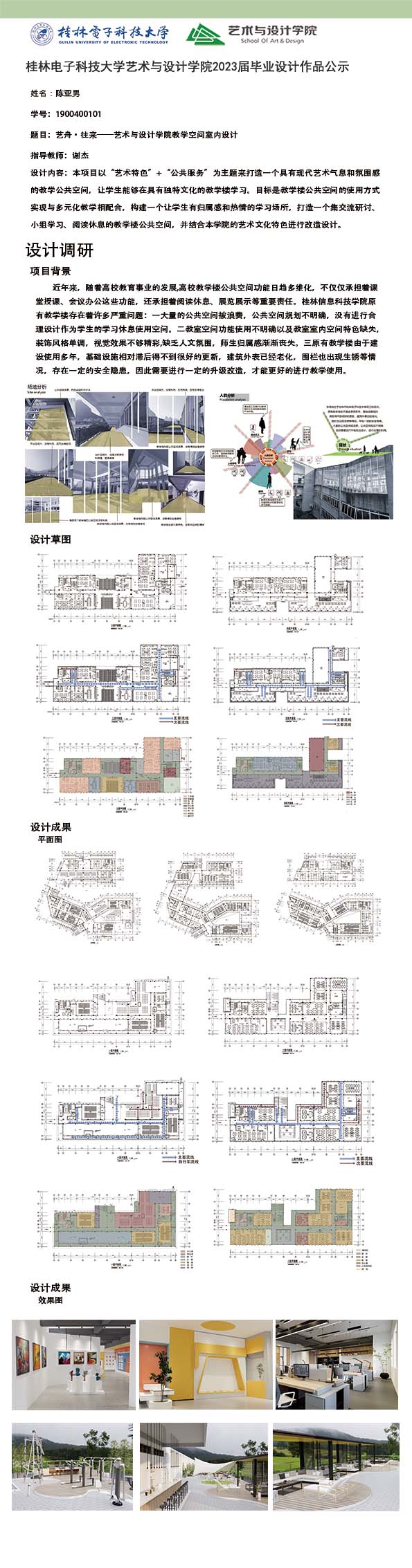 根据毕业设计管理文件规定,现将2023届环境设计专业毕业设计作品进行公示。对所公示的作品如有疑议,请实名举证。公示期为三天(2023.04.19-2023.04.21)。作品公示期间的意见反馈邮箱:19059776@qq.com,联系电话:13457651975。