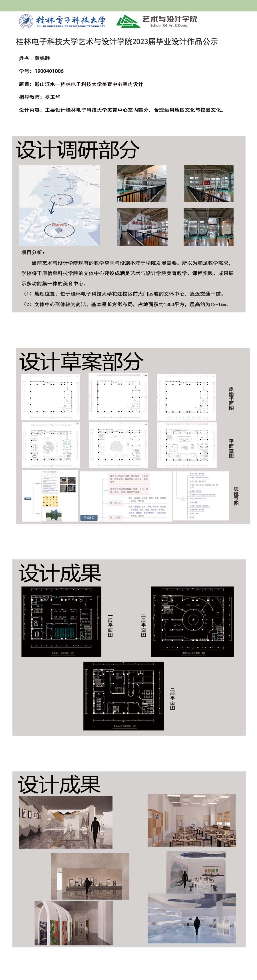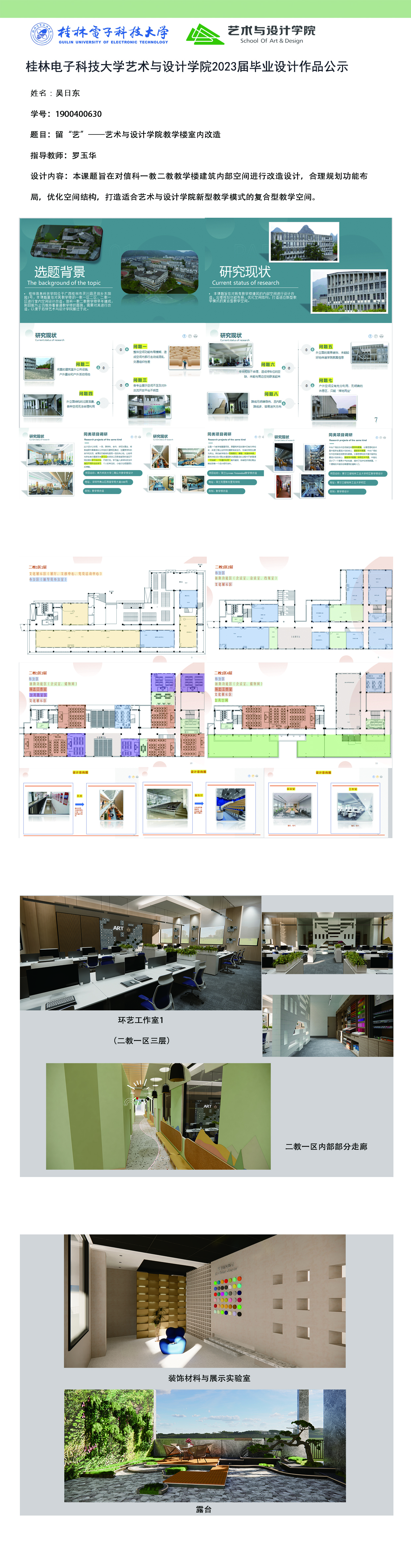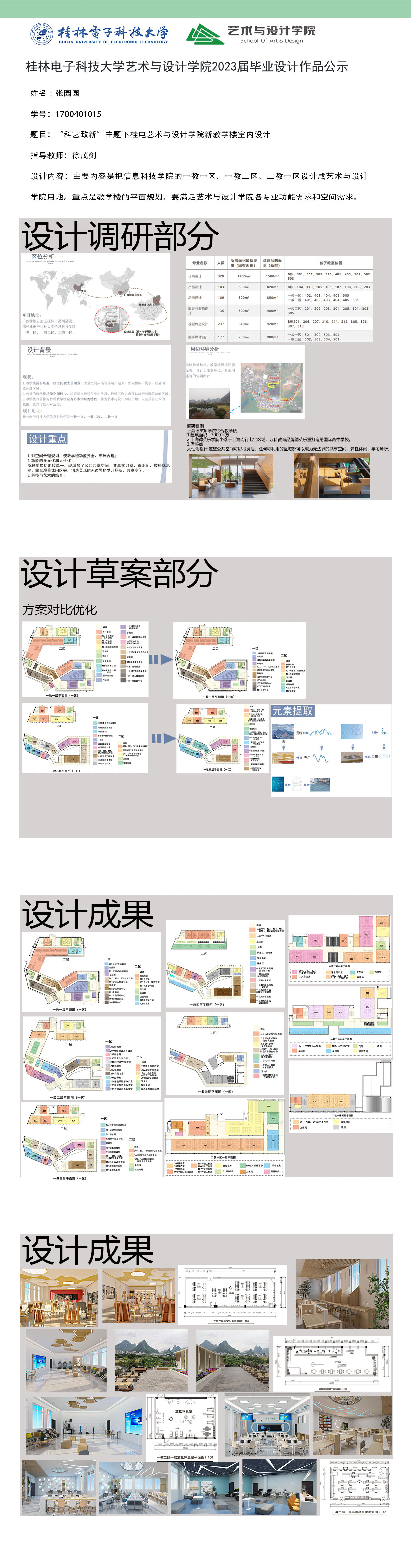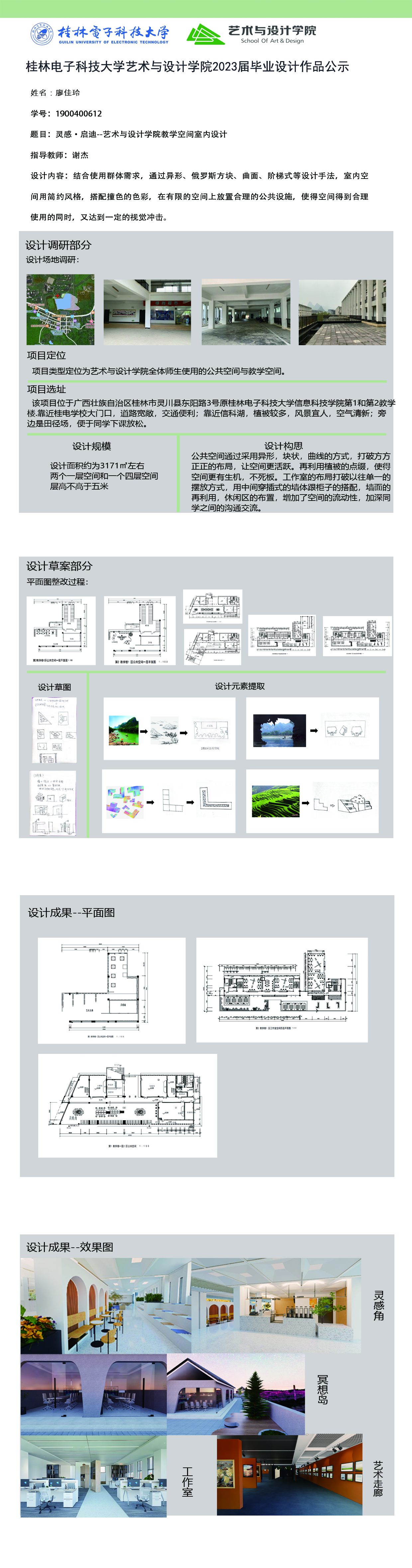 根据毕业设计管理文件规定,现将2023届环境设计专业毕业设计作品进行公示。对所公示的作品如有疑议,请实名举证。公示期为三天(2023.04.19-2023.04.21)。作品公示期间的意见反馈邮箱:19059776@qq.com,联系电话:13457651975。