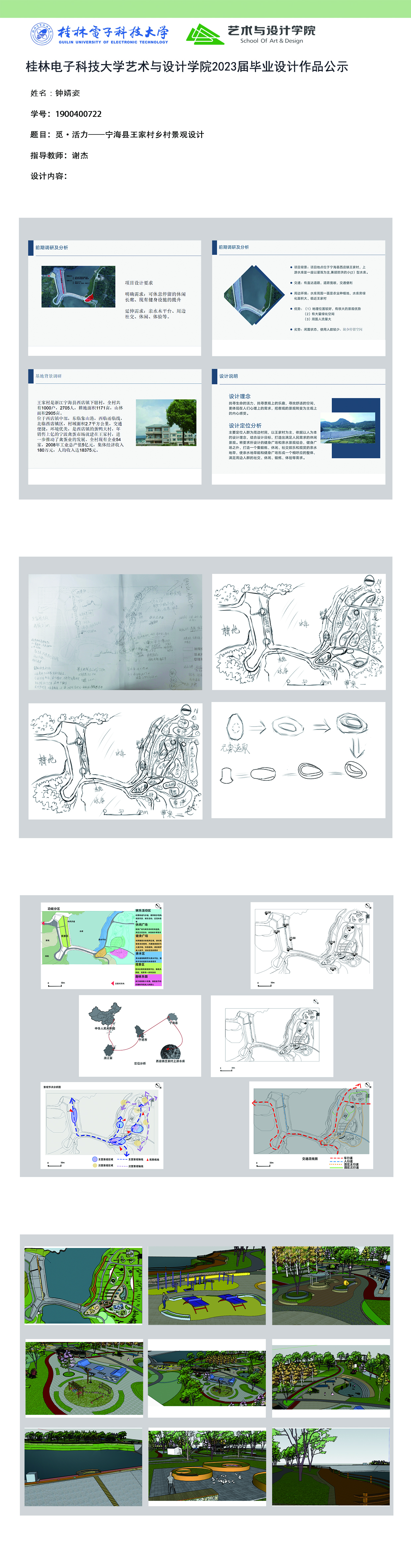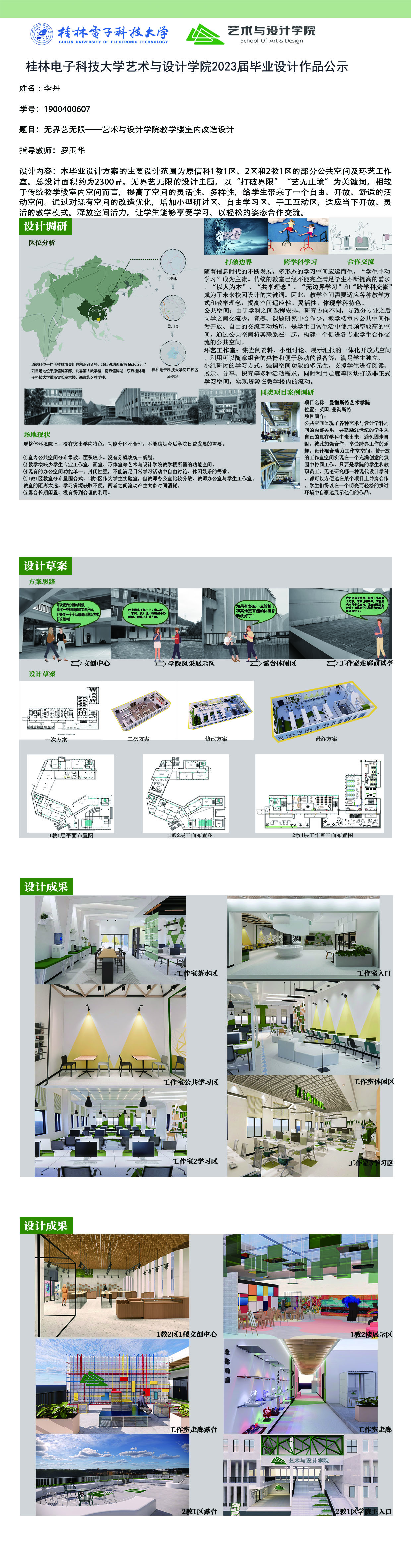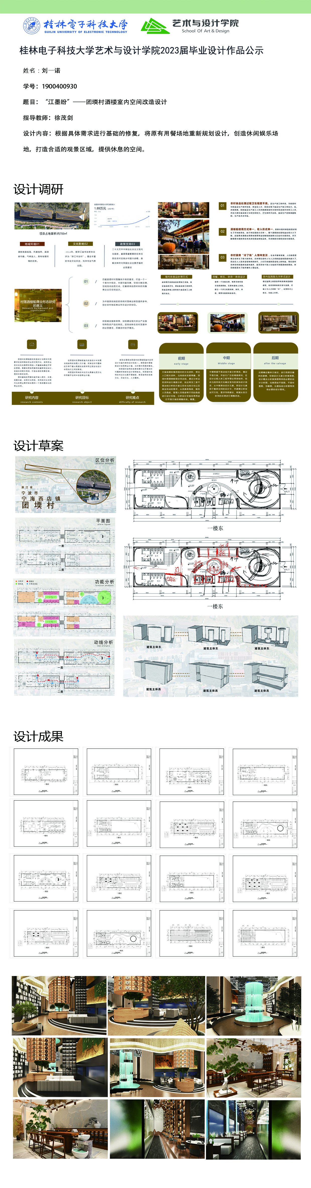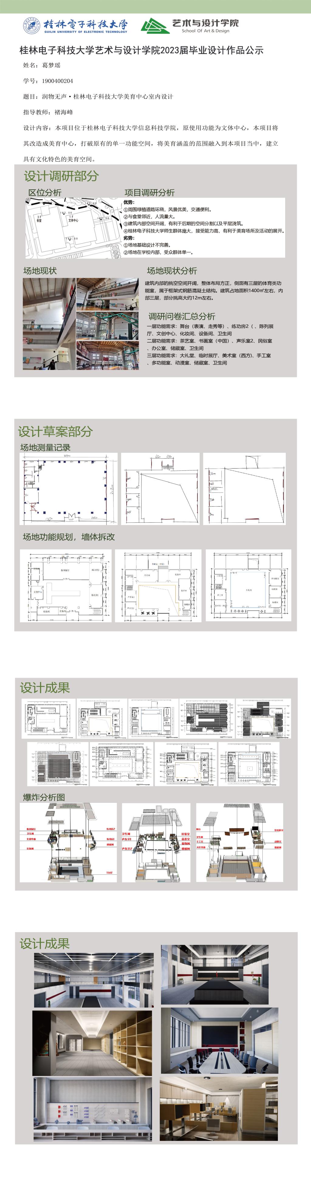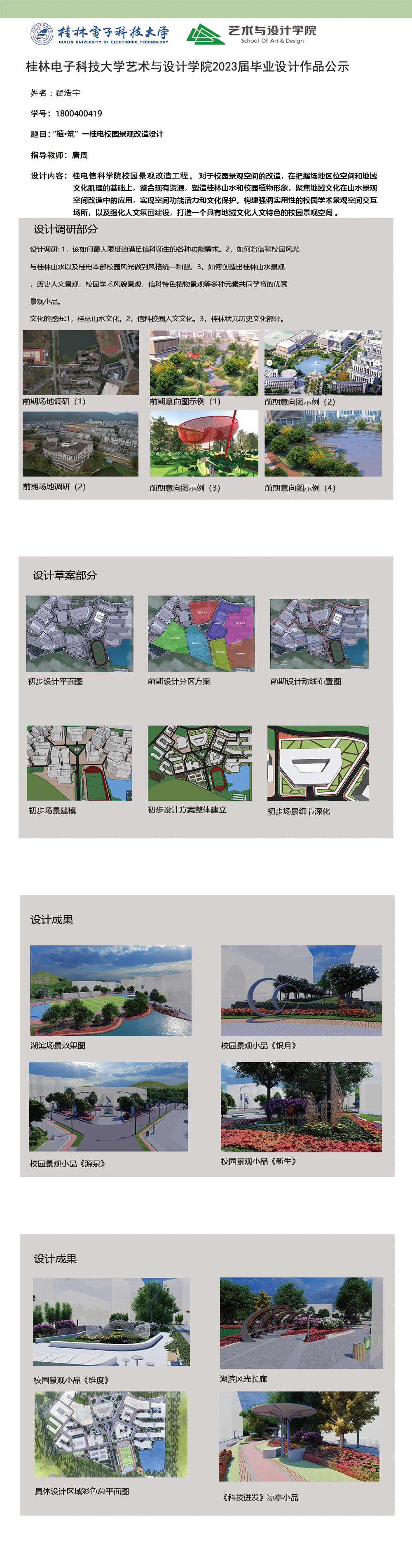 根据毕业设计管理文件规定,现将2023届环境设计专业毕业设计作品进行公示。对所公示的作品如有疑议,请实名举证。公示期为三天(2023.04.19-2023.04.21)。作品公示期间的意见反馈邮箱:19059776@qq.com,联系电话:13457651975。