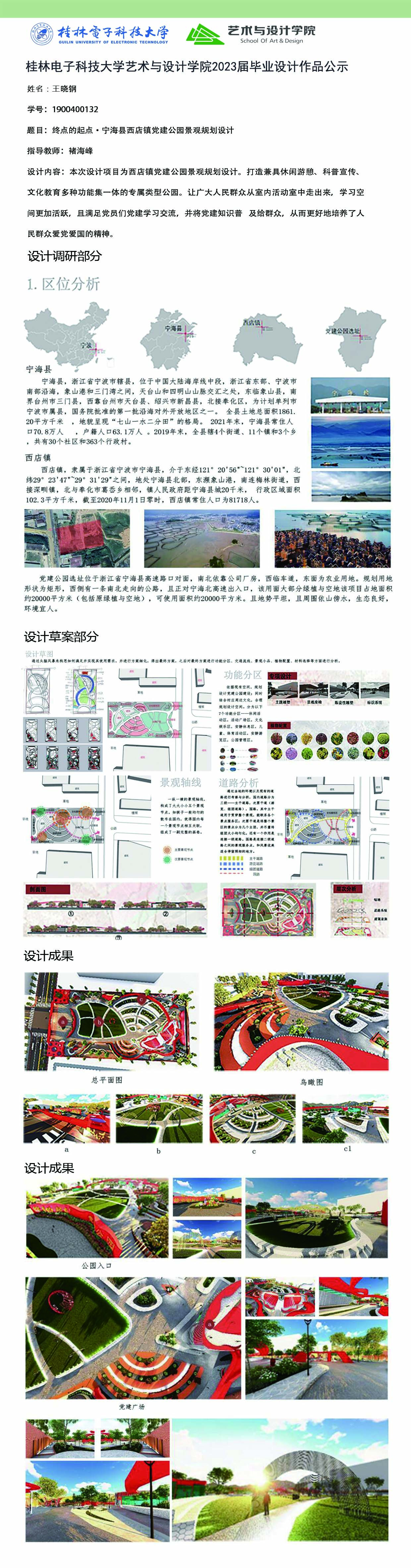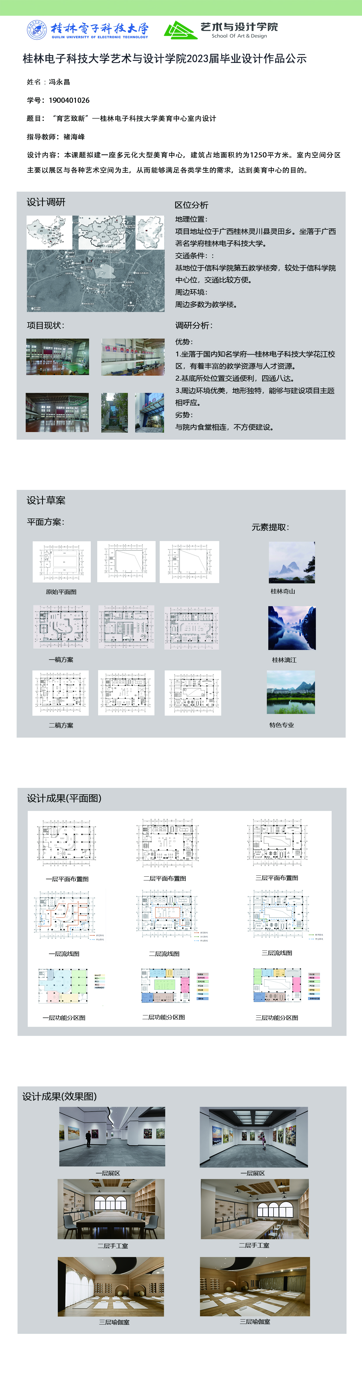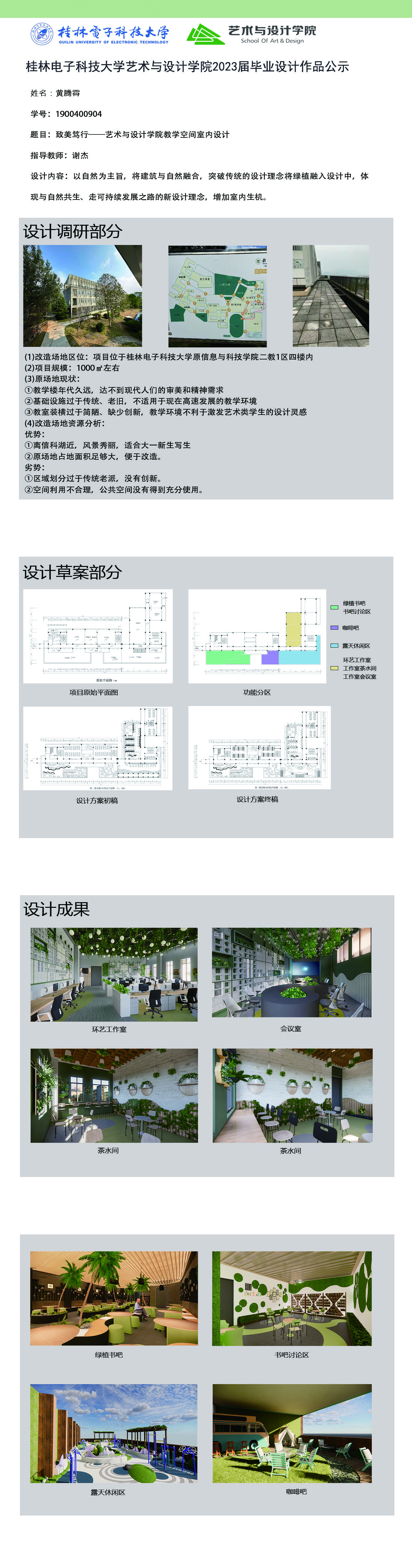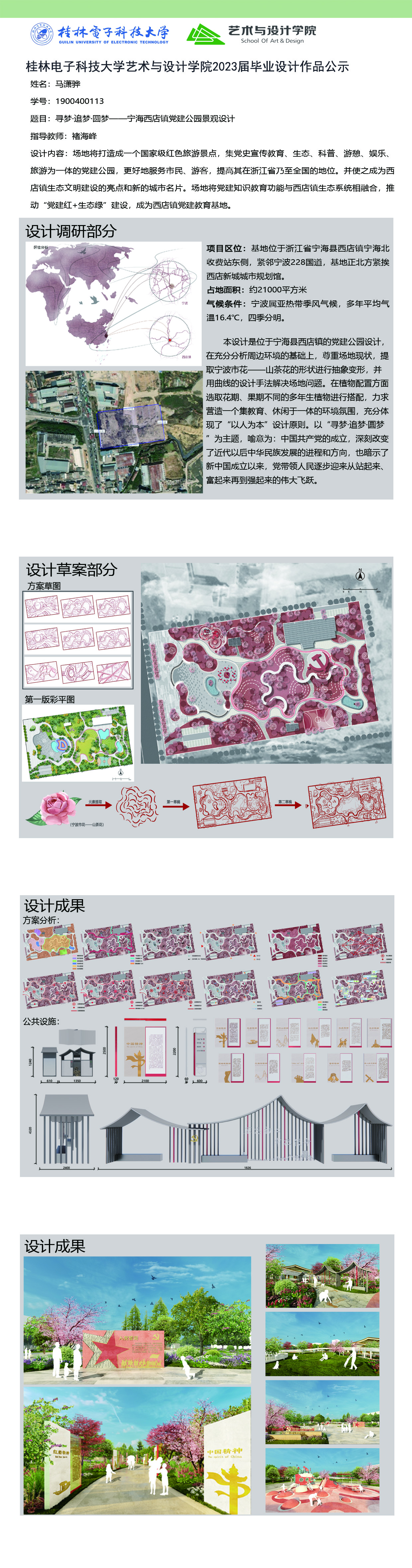根据毕业设计管理文件规定,现将2023届环境设计专业毕业设计作品进行公示。对所公示的作品如有疑议,请实名举证。公示期为三天(2023.04.19-2023.04.21)。作品公示期间的意见反馈邮箱:19059776@qq.com,联系电话:13457651975。