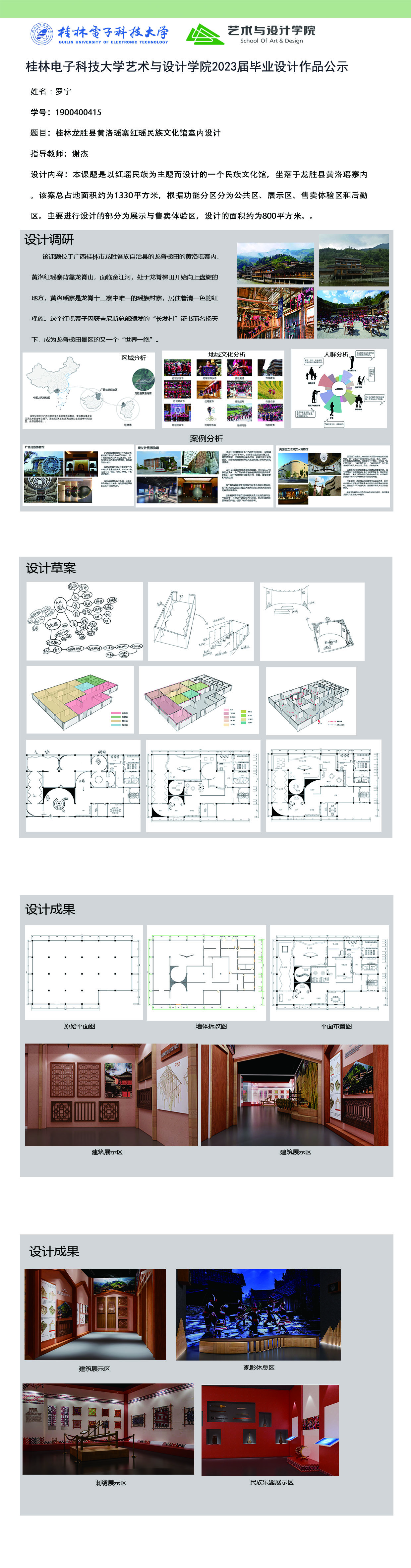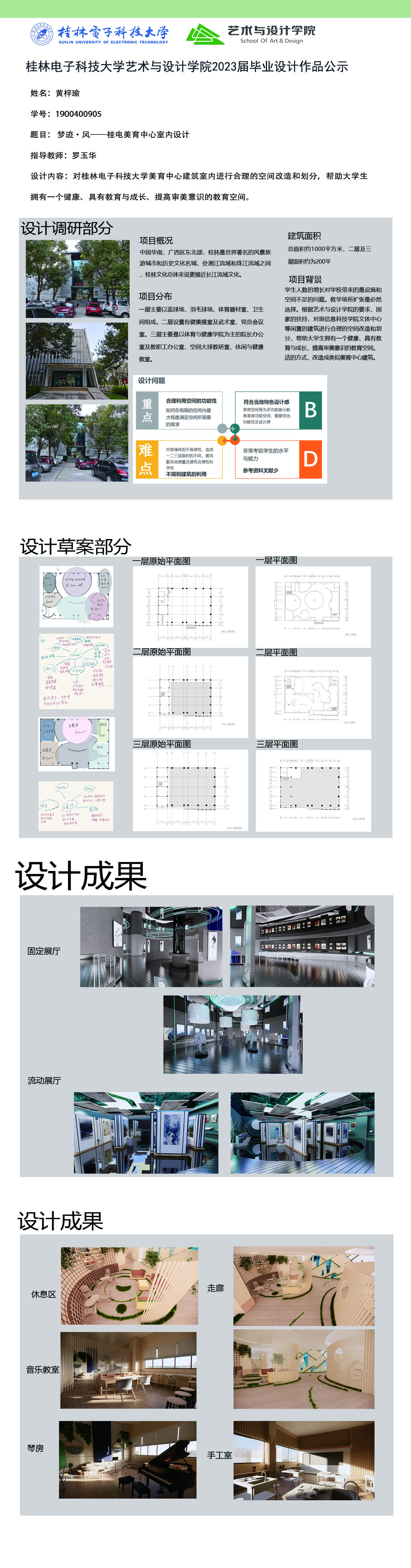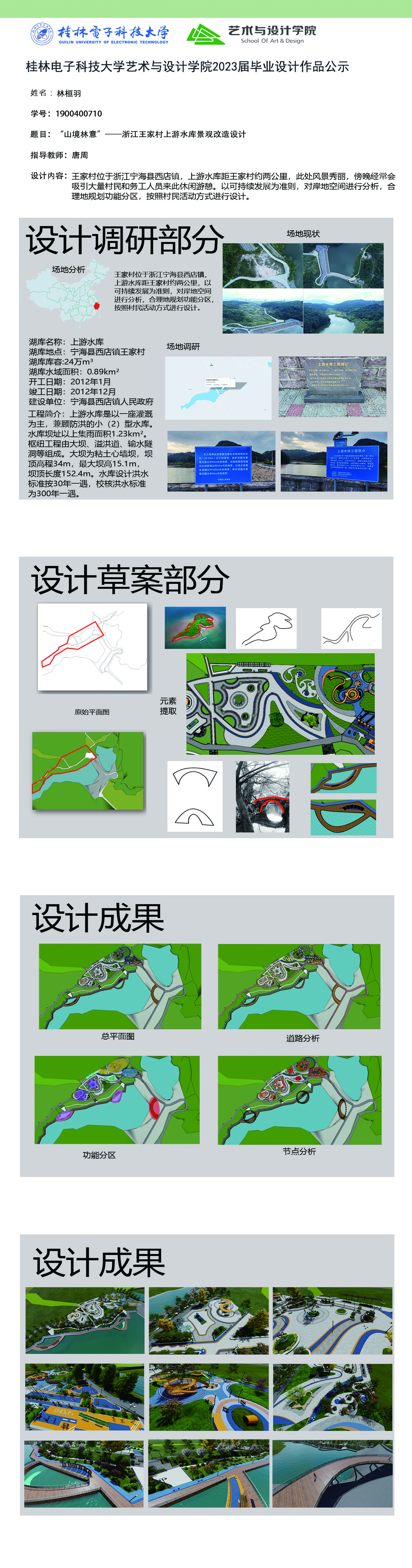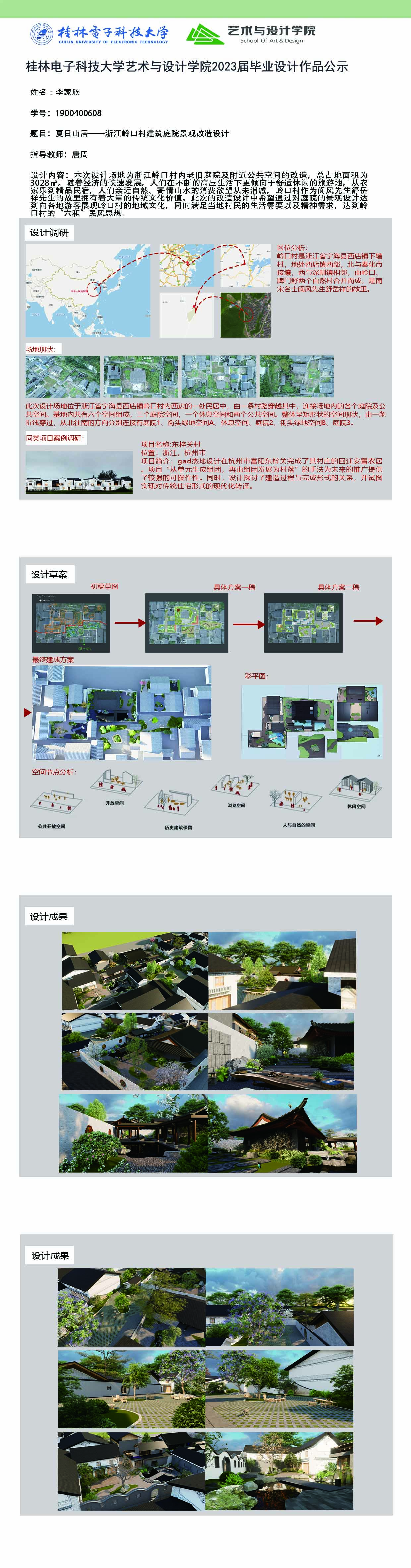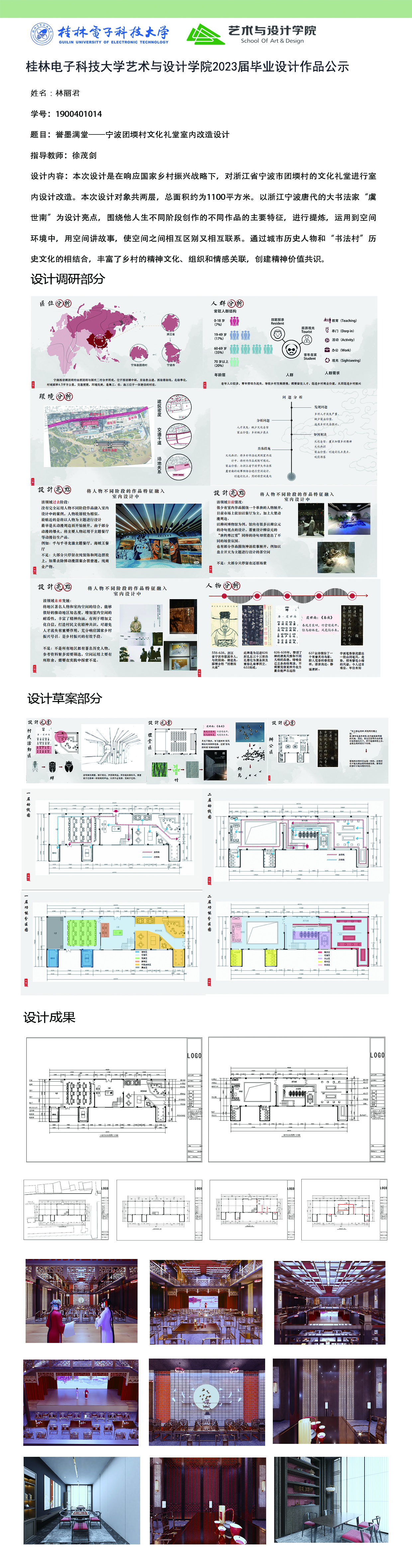 根据毕业设计管理文件规定,现将2023届环境设计专业毕业设计作品进行公示。对所公示的作品如有疑议,请实名举证。公示期为三天(2023.04.19-2023.04.21)。作品公示期间的意见反馈邮箱:19059776@qq.com,联系电话:13457651975。
