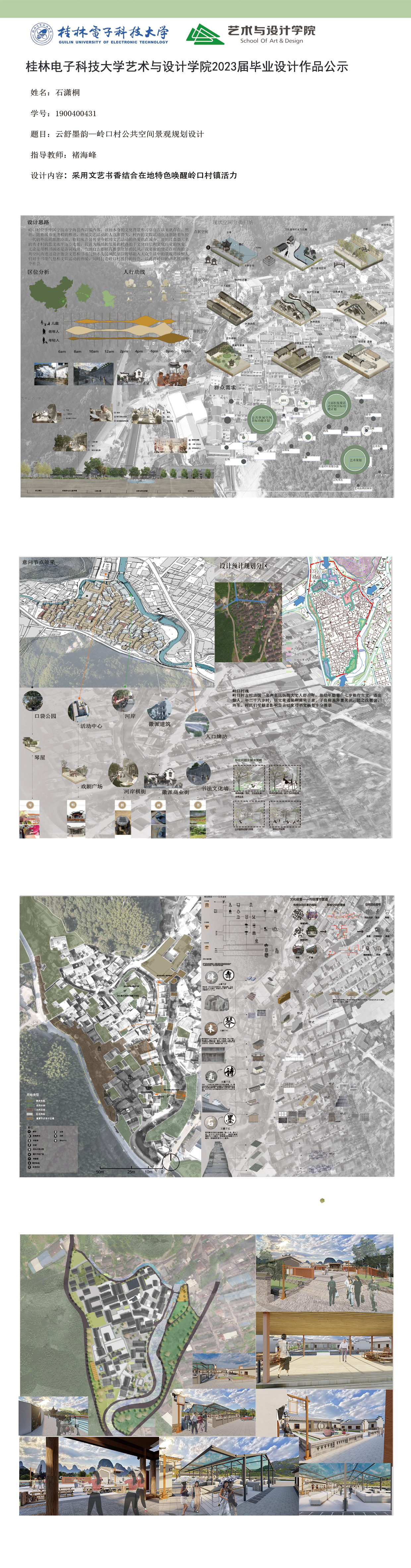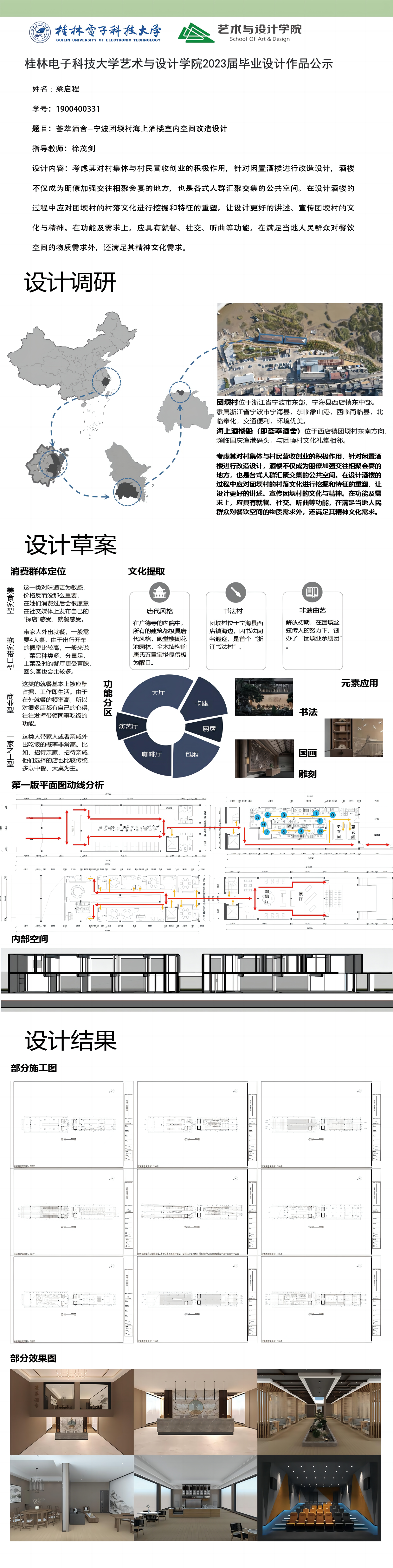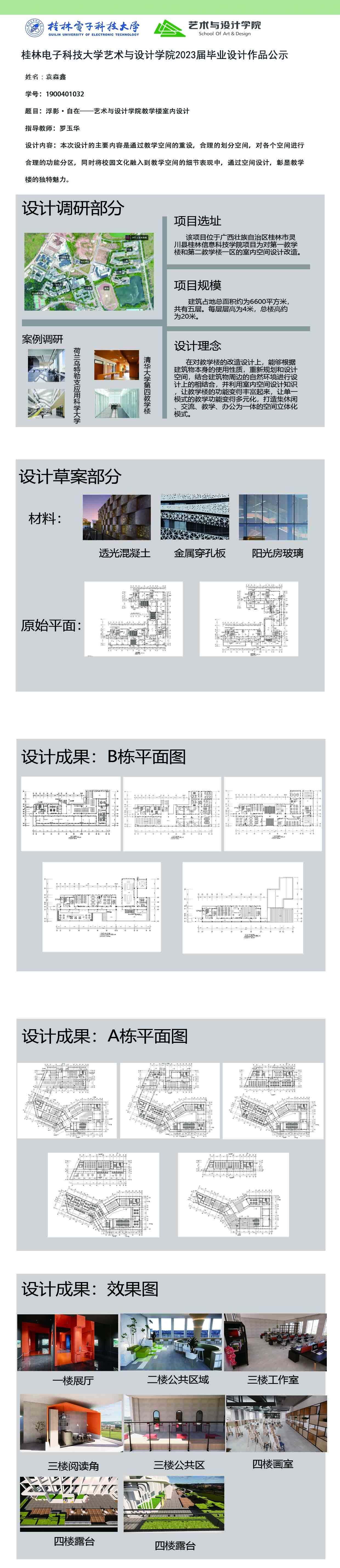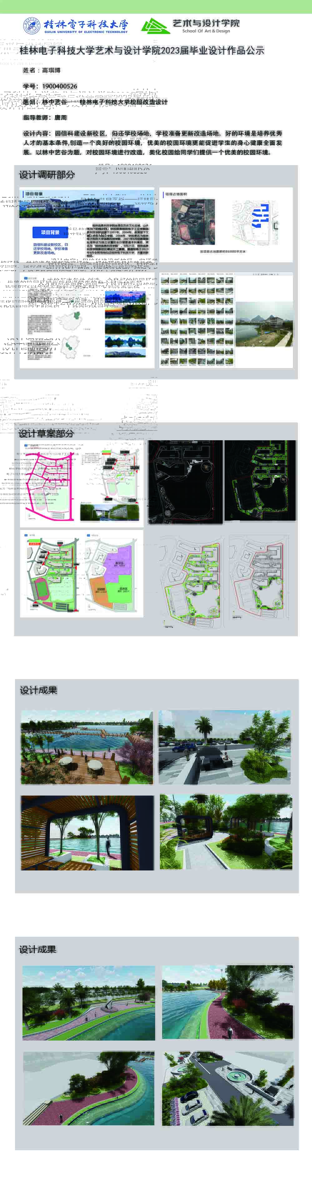 根据毕业设计管理文件规定,现将2023届环境设计专业毕业设计作品进行公示。对所公示的作品如有疑议,请实名举证。公示期为三天(2023.04.19-2023.04.21)。作品公示期间的意见反馈邮箱:19059776@qq.com,联系电话:13457651975。