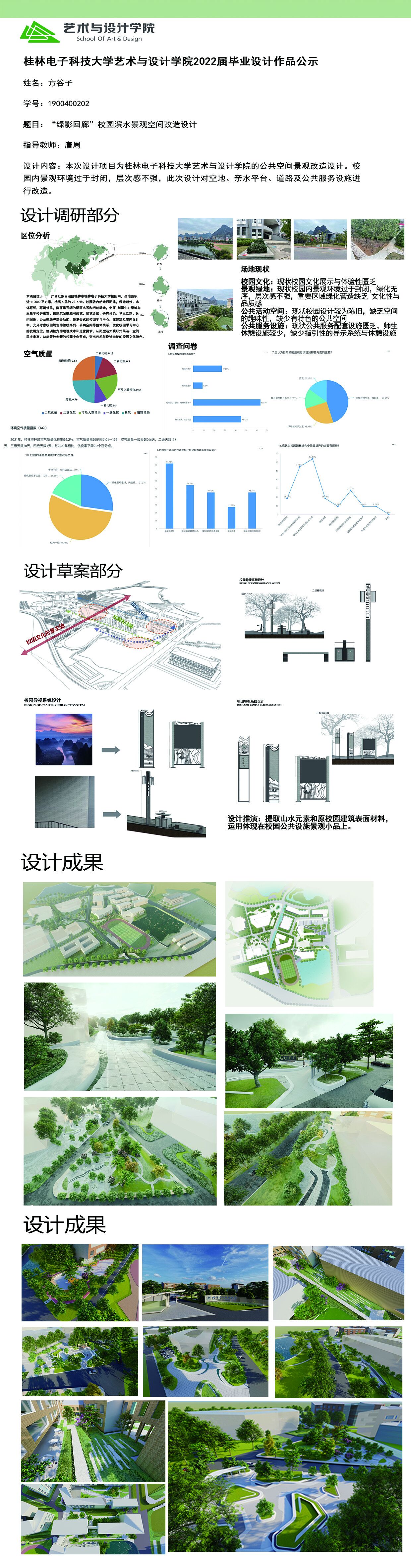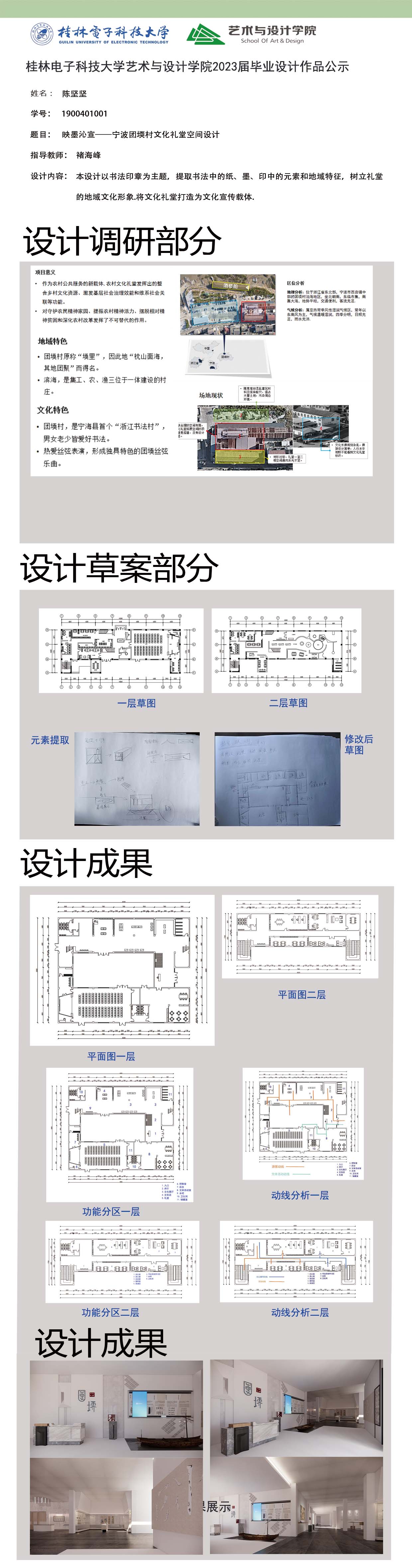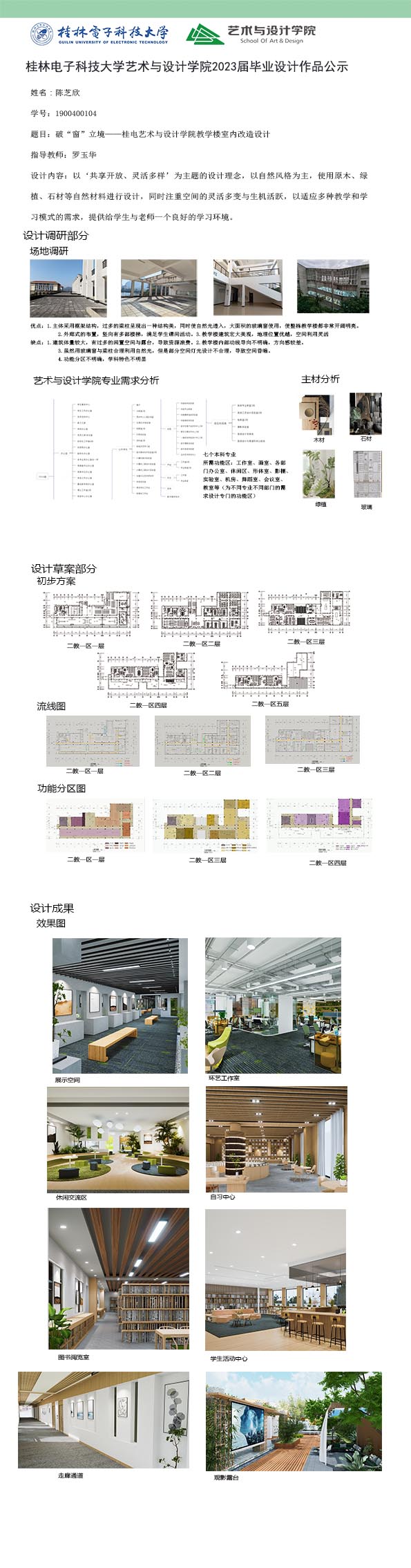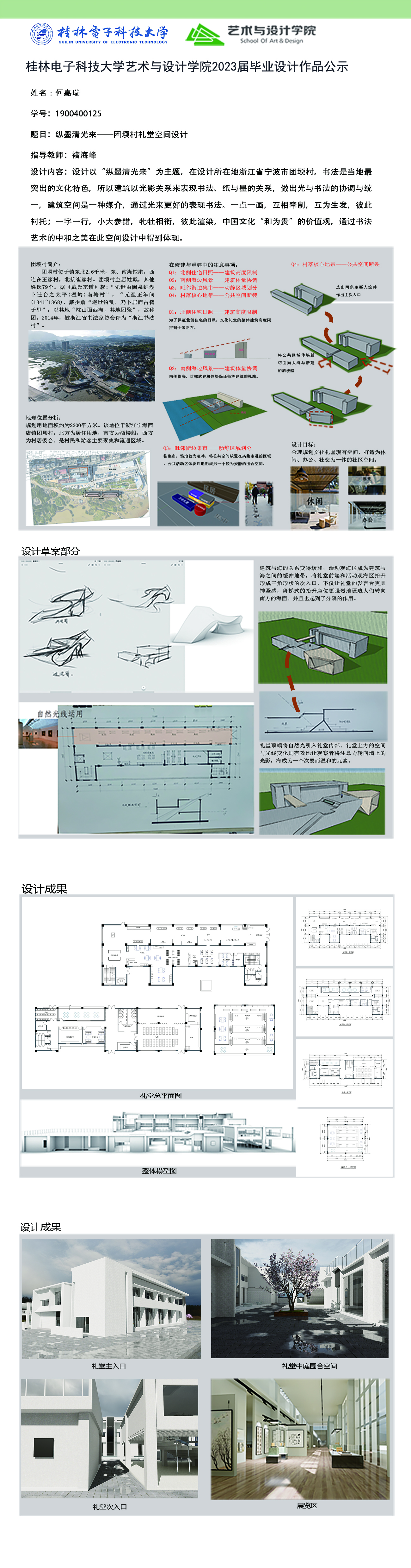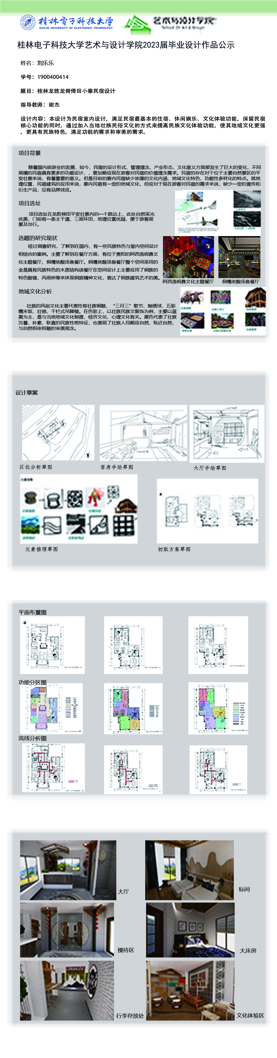 根据毕业设计管理文件规定,现将2023届环境设计专业毕业设计作品进行公示。对所公示的作品如有疑议,请实名举证。公示期为三天(2023.04.19-2023.04.21)。作品公示期间的意见反馈邮箱:19059776@qq.com,联系电话:13457651975。
