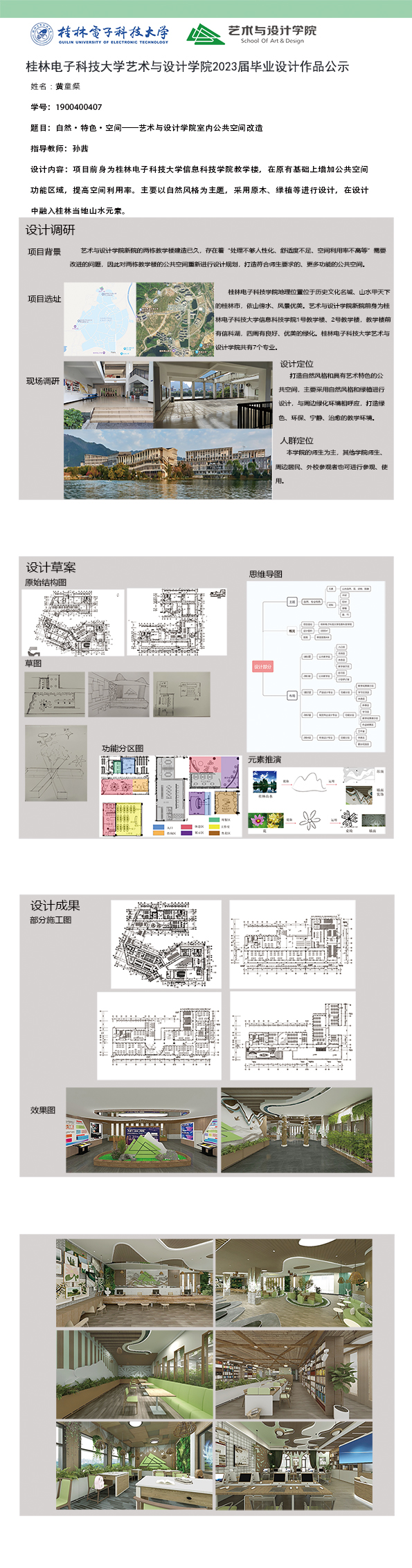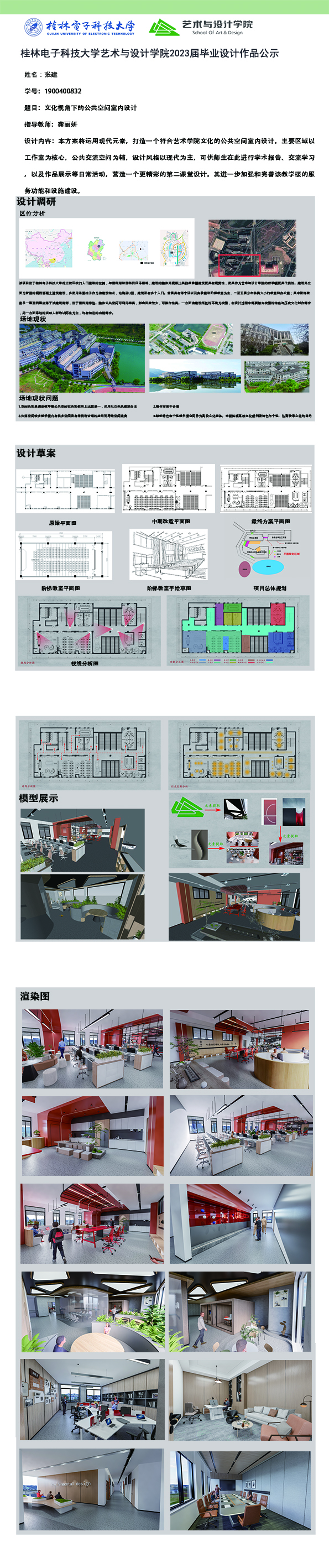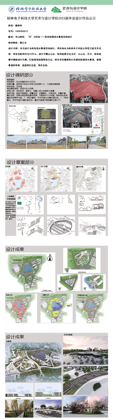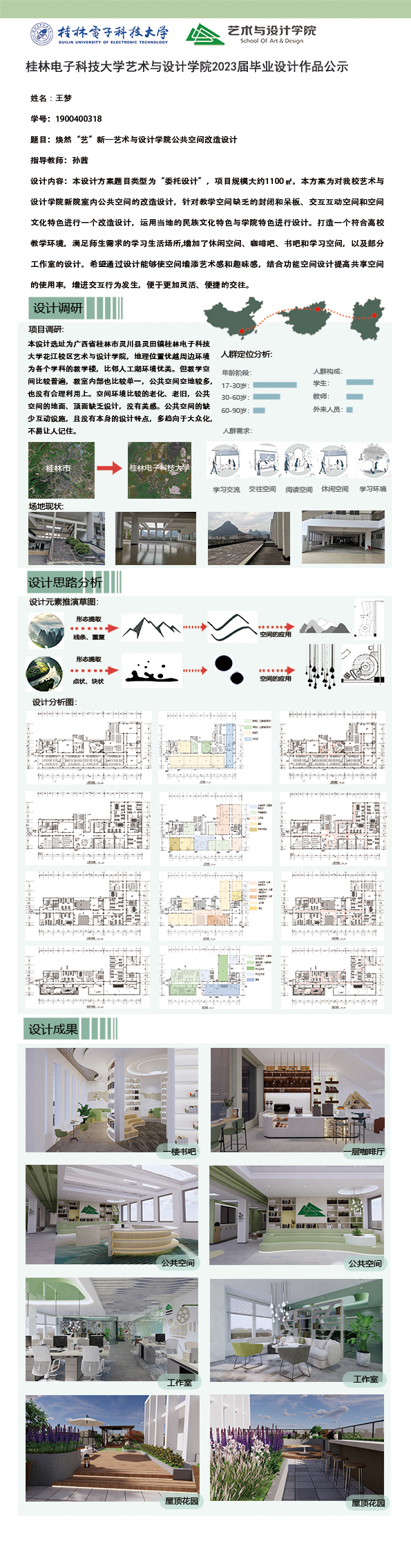 根据毕业设计管理文件规定,现将2023届环境设计专业毕业设计作品进行公示。对所公示的作品如有疑议,请实名举证。公示期为三天(2023.04.19-2023.04.21)。作品公示期间的意见反馈邮箱:19059776@qq.com,联系电话:13457651975。