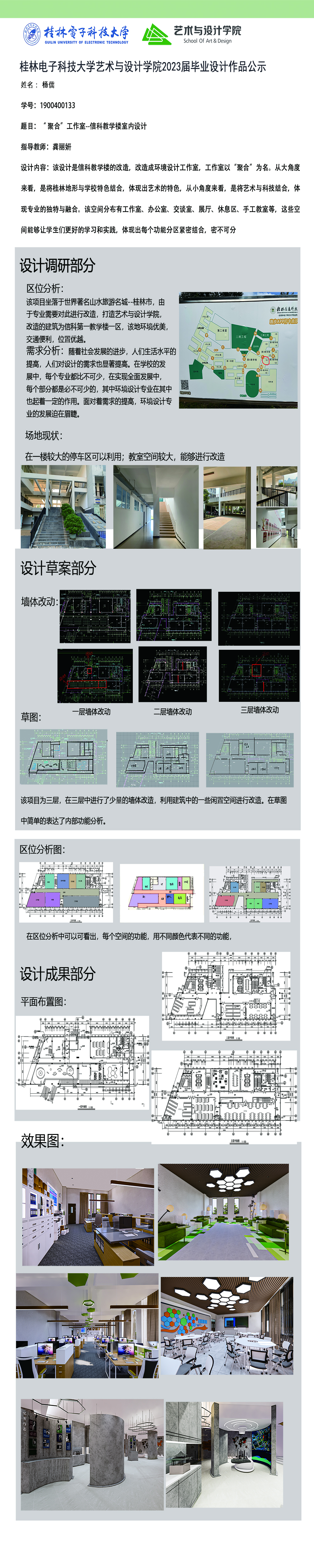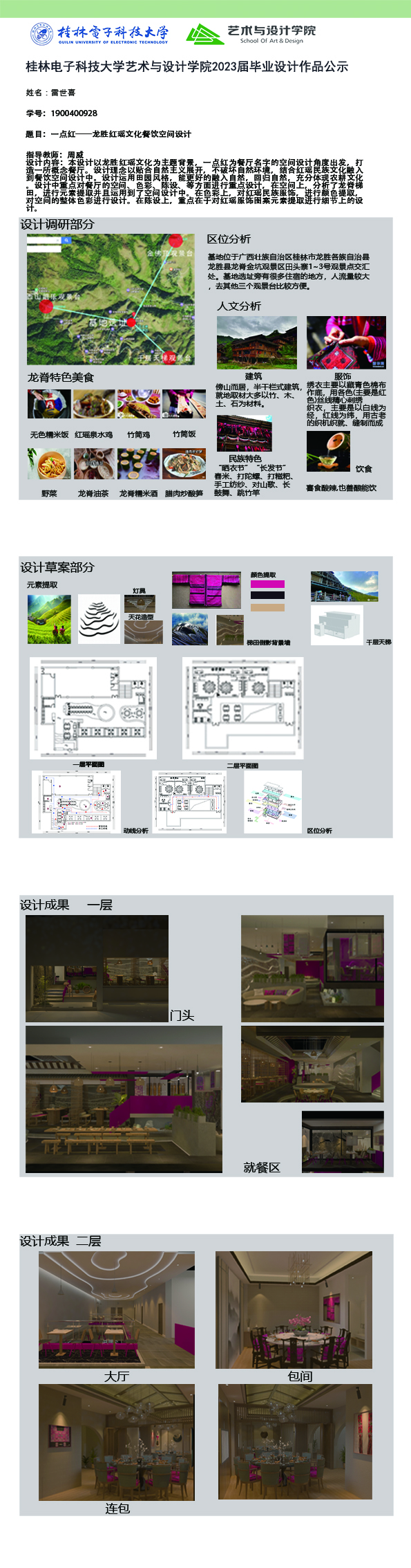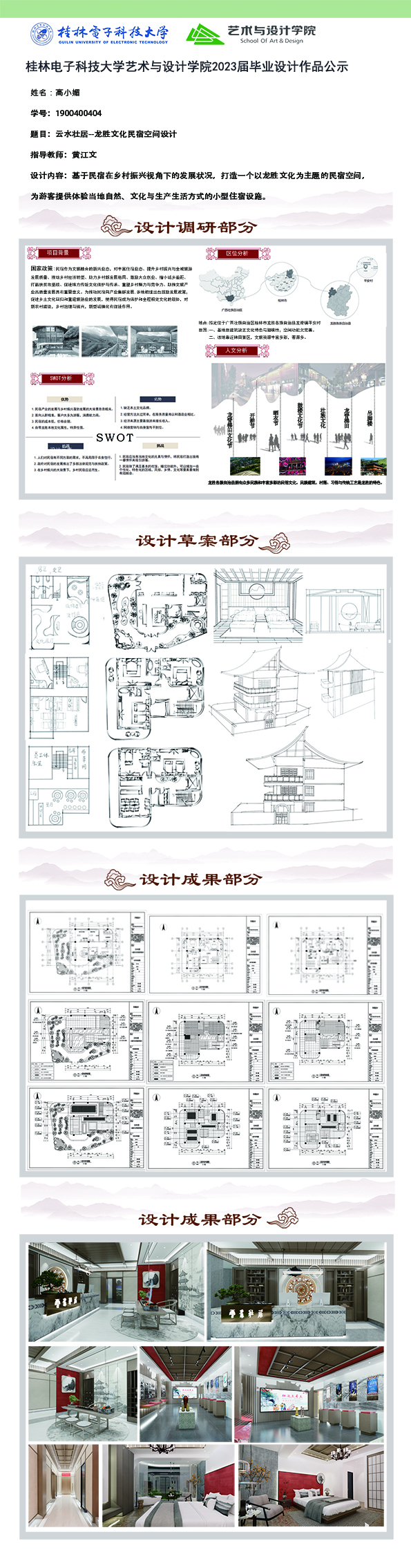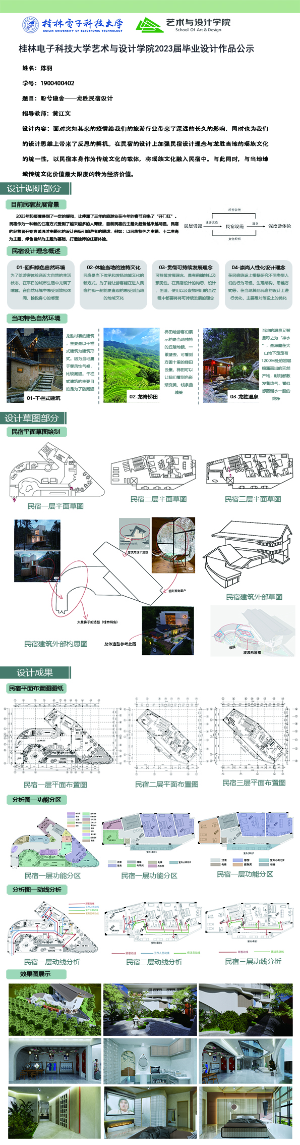 根据毕业设计管理文件规定,现将2023届环境设计专业毕业设计作品进行公示。对所公示的作品如有疑议,请实名举证。公示期为三天(2023.04.19-2023.04.21)。作品公示期间的意见反馈邮箱:19059776@qq.com,联系电话:13457651975。
