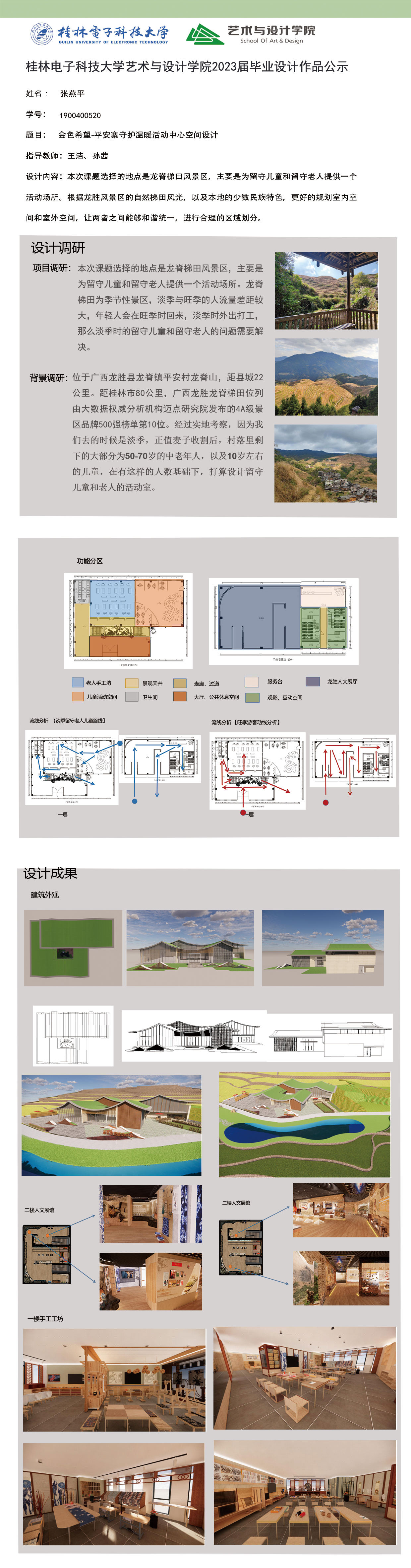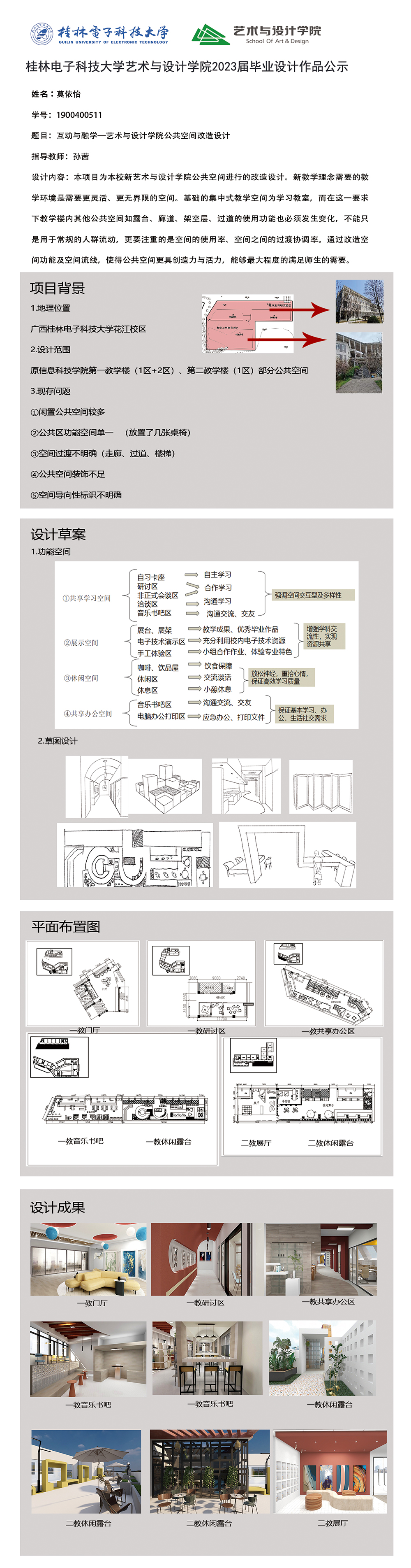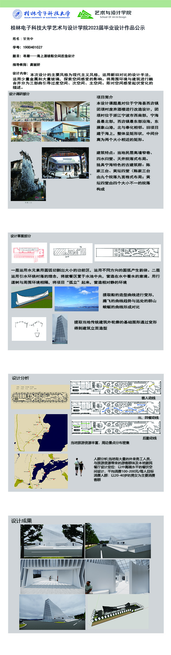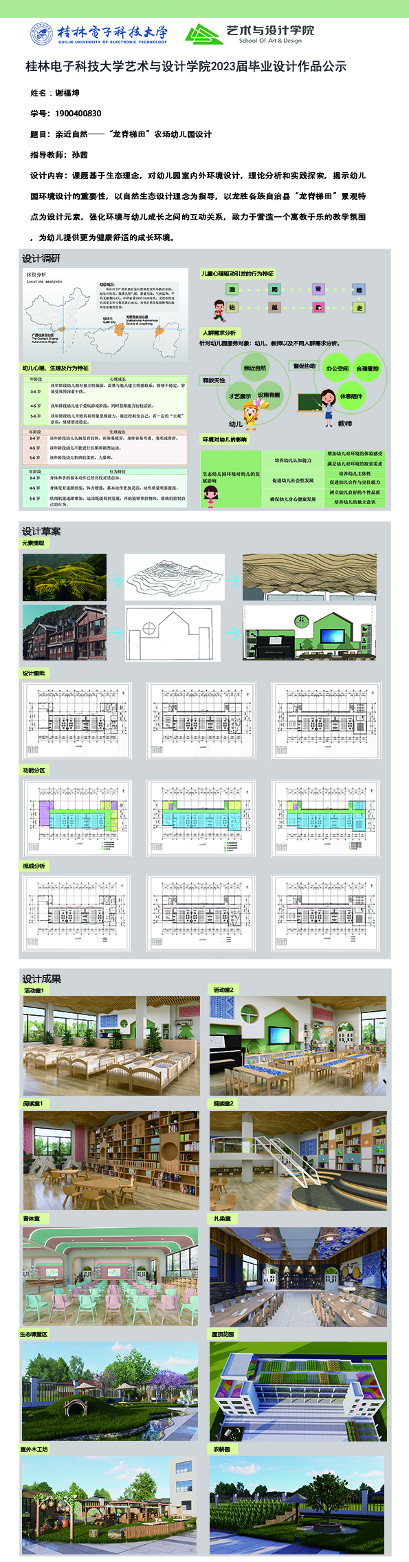 根据毕业设计管理文件规定,现将2023届环境设计专业毕业设计作品进行公示。对所公示的作品如有疑议,请实名举证。公示期为三天(2023.04.19-2023.04.21)。作品公示期间的意见反馈邮箱:19059776@qq.com,联系电话:13457651975。