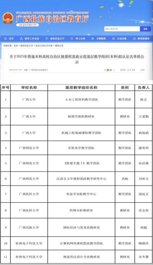 近日,广西教育厅公布了2023广西普通本科高校课程思政示范课程(本科)和课程思政示范基层教学组织(本科)立项名单,我院宋冬慧教授的视觉传达设计专业教研室在2023年广西普通本科高校课程思政示范基层教学组织(本科)评选中荣获殊荣。