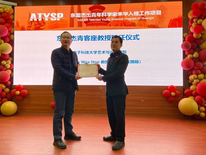 2024年1月19日,桂林电子科技大学艺术与设计学院在花江校区14208成功举办了东盟杰出青年科学家来华入桂工作项目(以下简称“东盟杰青项目”)签约暨项目开题报告会。艺术与设计学院院长叶德辉教授主持了签约仪式,项目负责人马来西亚杰青陈伟豪教授、主要成员黄艳梅副教授,学院教师代表和学生参与了本次活动。叶院长详细介绍了项目负责人和项目管理的相关规定,并向陈伟豪教授颁发了客座教授聘书,这次活动标志着“东盟杰青项目”的正式启动。