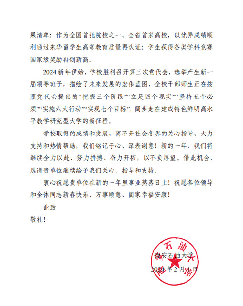 在信中,西安石油大学首先回顾了过去一年学校在学科建设、科研创新、人才培养等方面取得的显著成果。学校表示,在石油与天然气工程等优势学科领域,不仅加强了师资队伍建设,还取得了一系列重要的科研成果。同时,学校还注重培养学生的实践能力和创新精神,为他们提供了更广阔的发展平台。