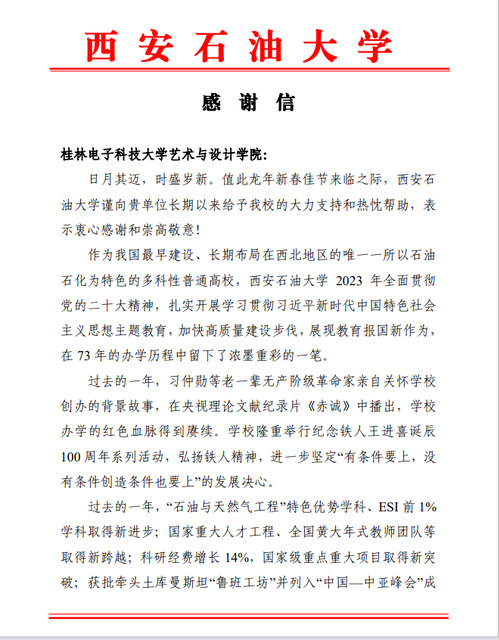 2月1日,西安石油大学向桂林电子科技大学艺术与设计学院发出感谢信,详细介绍了学校近一年的发展情况,并对桂林电子科技大学艺术与设计学院的帮助与支持表达了由衷的感谢。