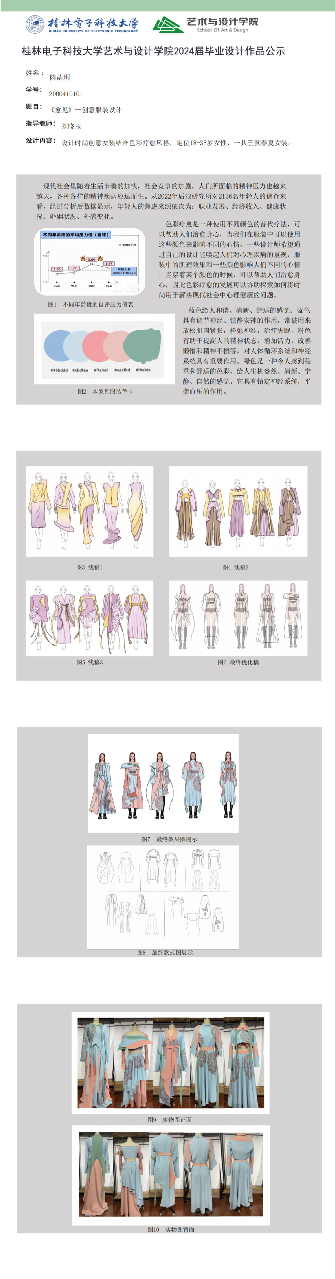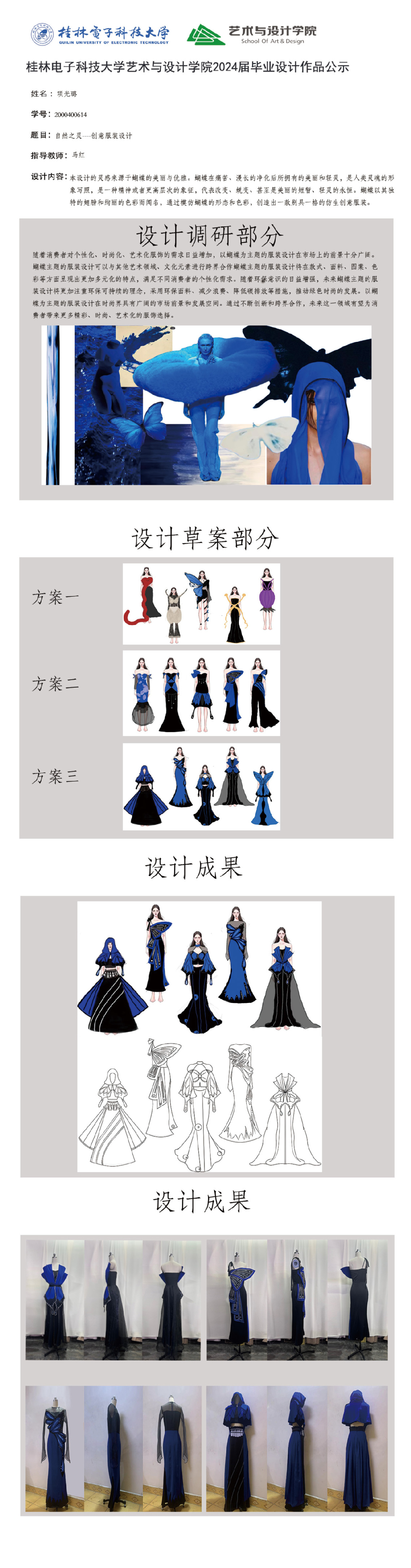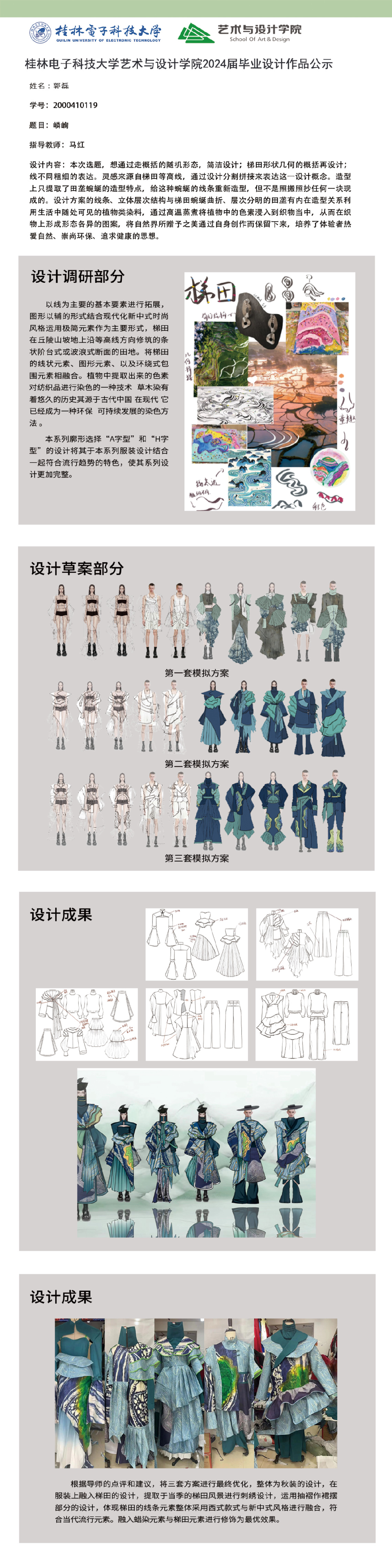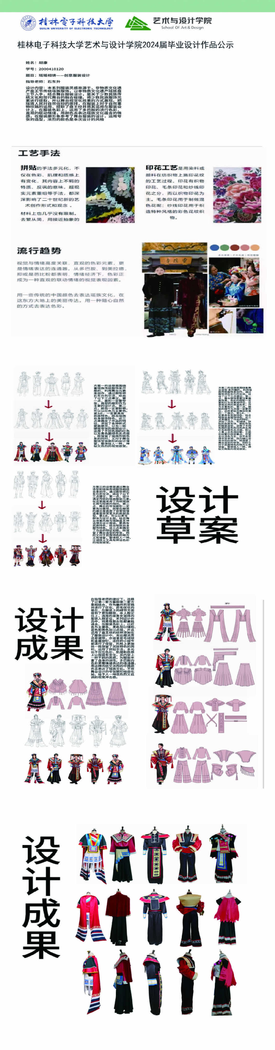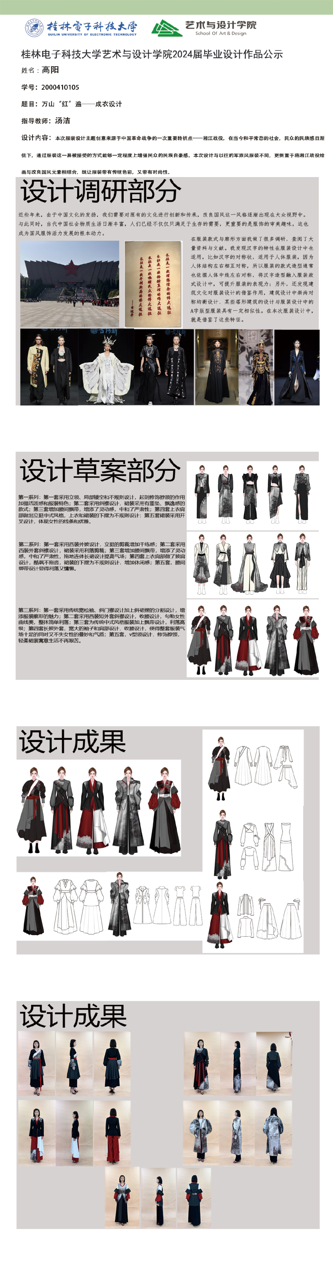 根据毕业设计管理文件规定,现将2024届服装与服饰计专业毕业设计作品进行公示。对所公示的作品如有疑议,请实名举证。公示期为三天(2024.04.25-2024.04.27)。作品公示期间的意见反馈邮箱:452660258@qq.com,联系电话:18593281965。
