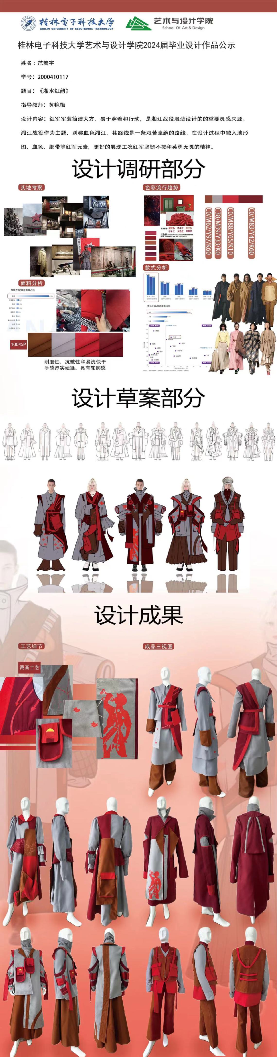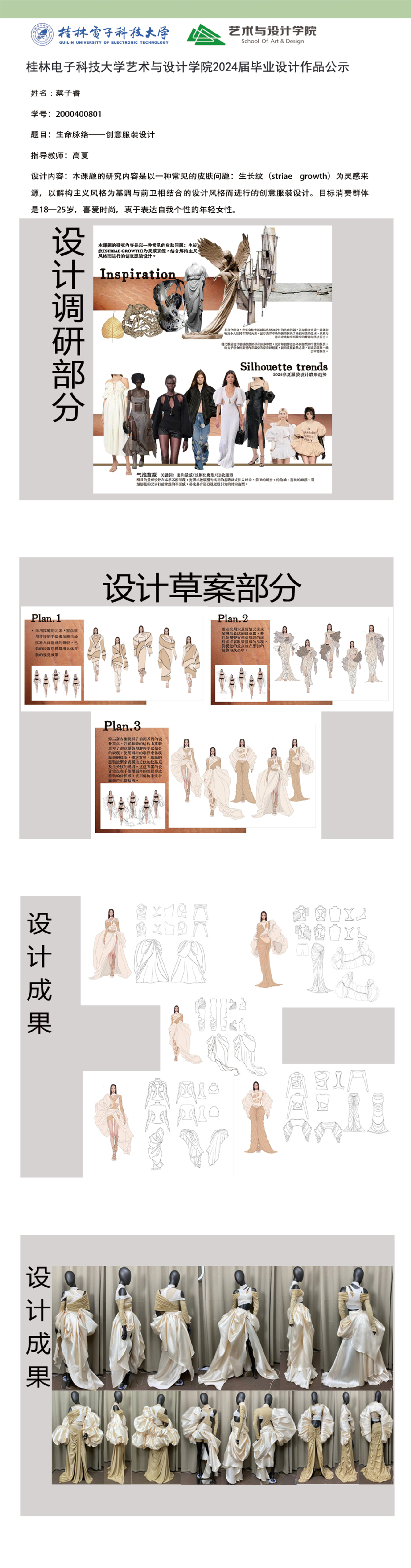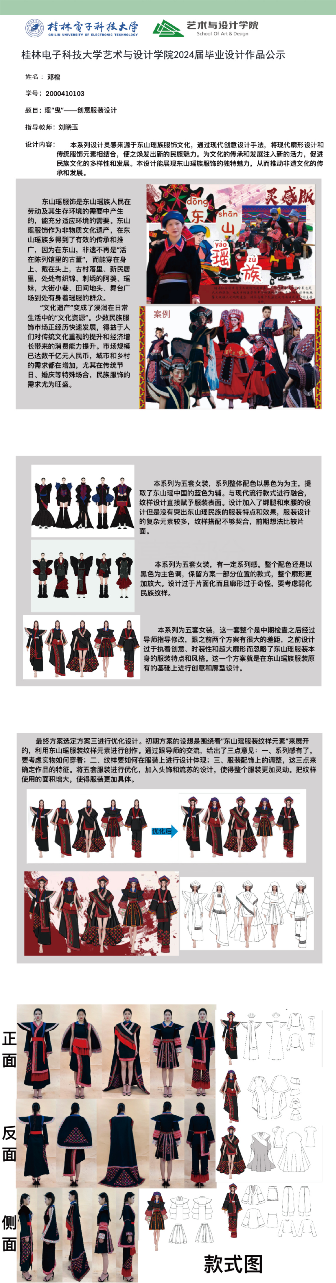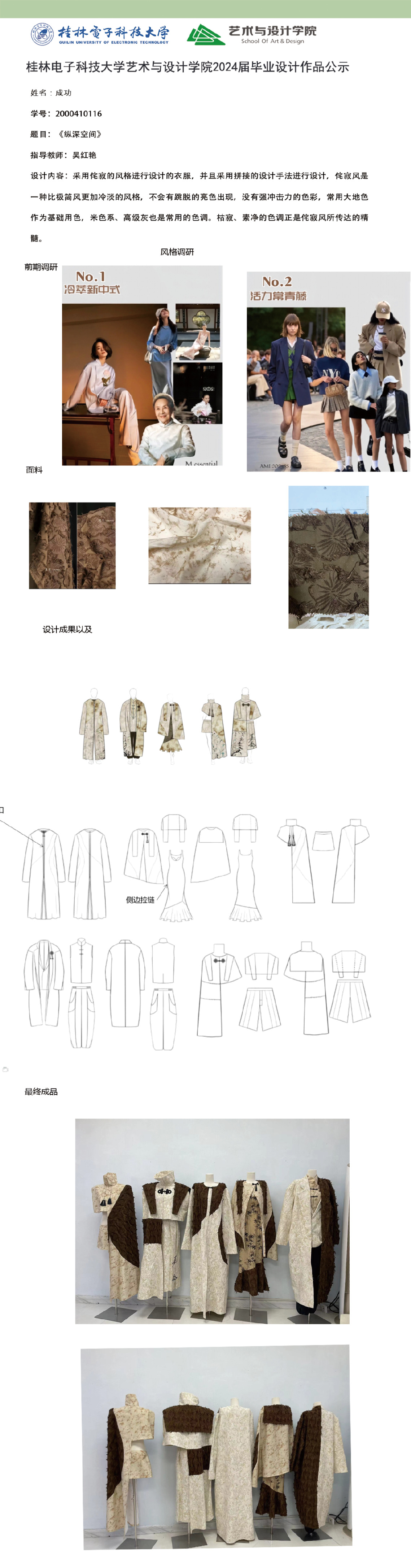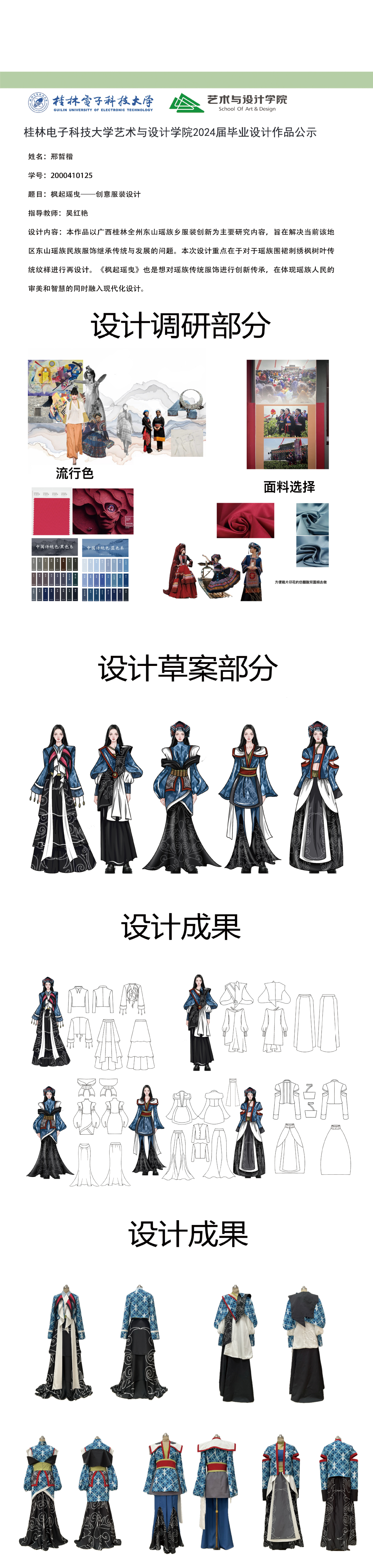 根据毕业设计管理文件规定,现将2024届服装与服饰计专业毕业设计作品进行公示。对所公示的作品如有疑议,请实名举证。公示期为三天(2024.04.25-2024.04.27)。作品公示期间的意见反馈邮箱:452660258@qq.com,联系电话:18593281965。